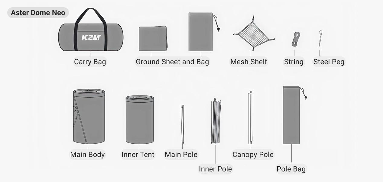 Main Body * 1, Inner Tent * 1, Ground Sheet * 1, Ground Sheet Bag * 1, Mesh Shelf * 1, String * 8, Steel Peg * 21, Carry Bag * 1