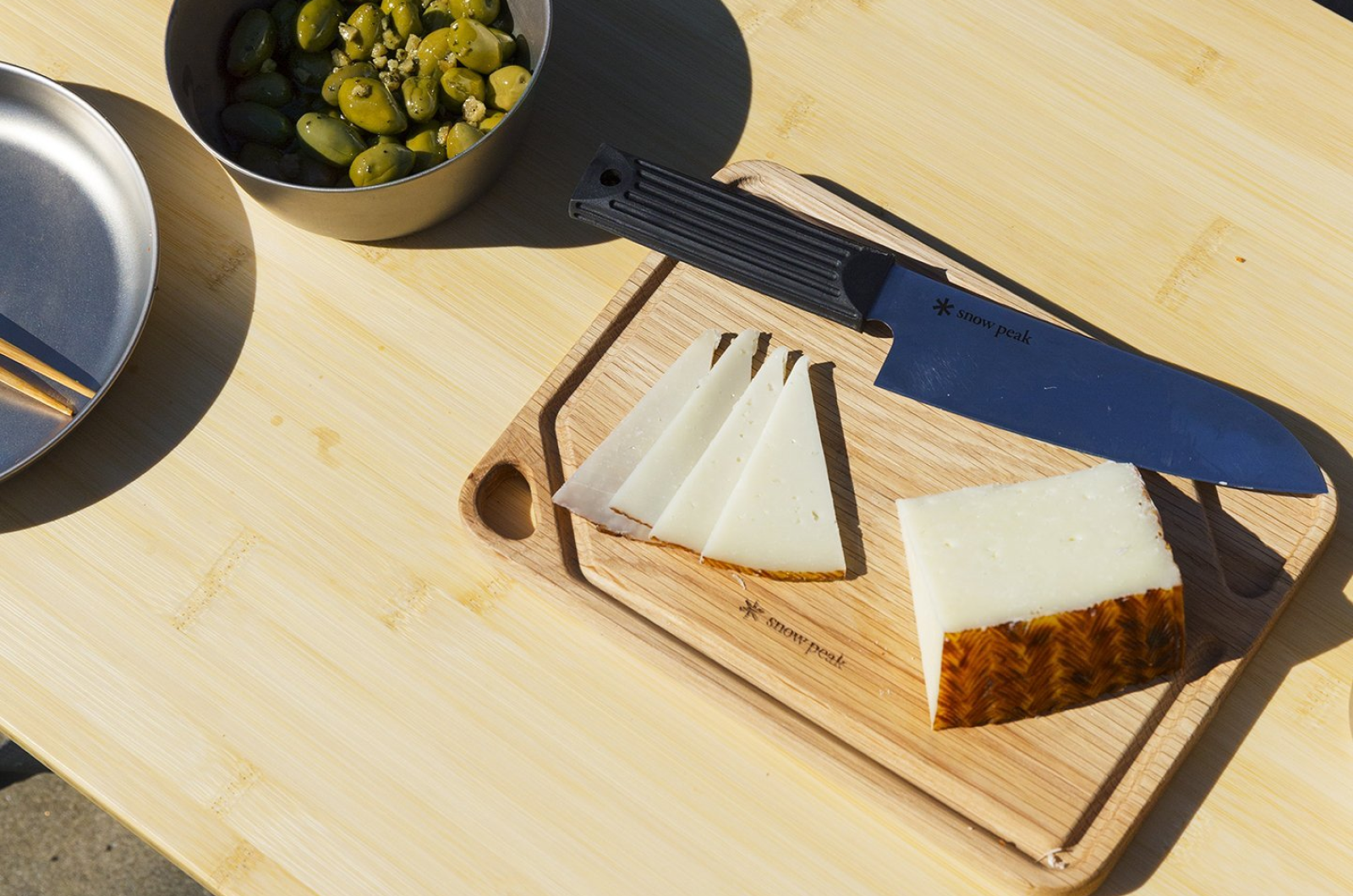 The Snow Peak Charcuterie Plate is crafted from solid oak, providing a versatile board that functions as both a small cutting surface and a stylish serving platter. A convenient corner hole allows for easy hanging and storage after use.