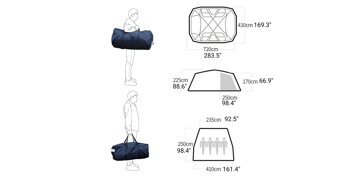 • Inner Tent: 161.4(92.5)"(W) × 98.4"(D) × 66.9"(H)