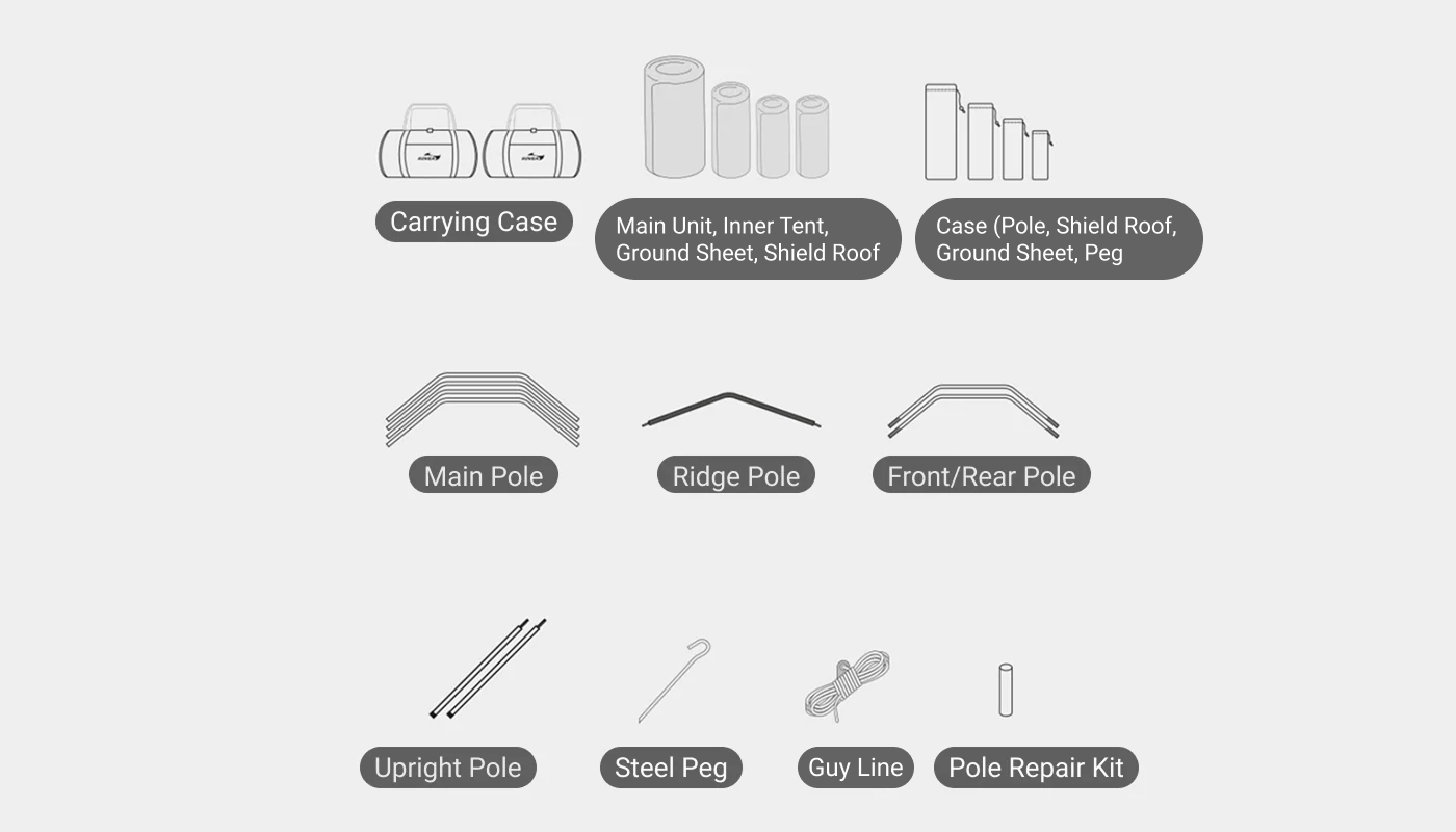 Package Includes: Carrying Case * 2 , Main Unit * 1, Inner Tent * 1, Shield Roof * 1, Ground Sheet * 1, Main Pole * 4, Ridge Pole * 1, Front/Rear Pole * 2, Upright Pole * 2, Steel Peg * 33, Guy Lines * 16, Pole Repair Kit * 1