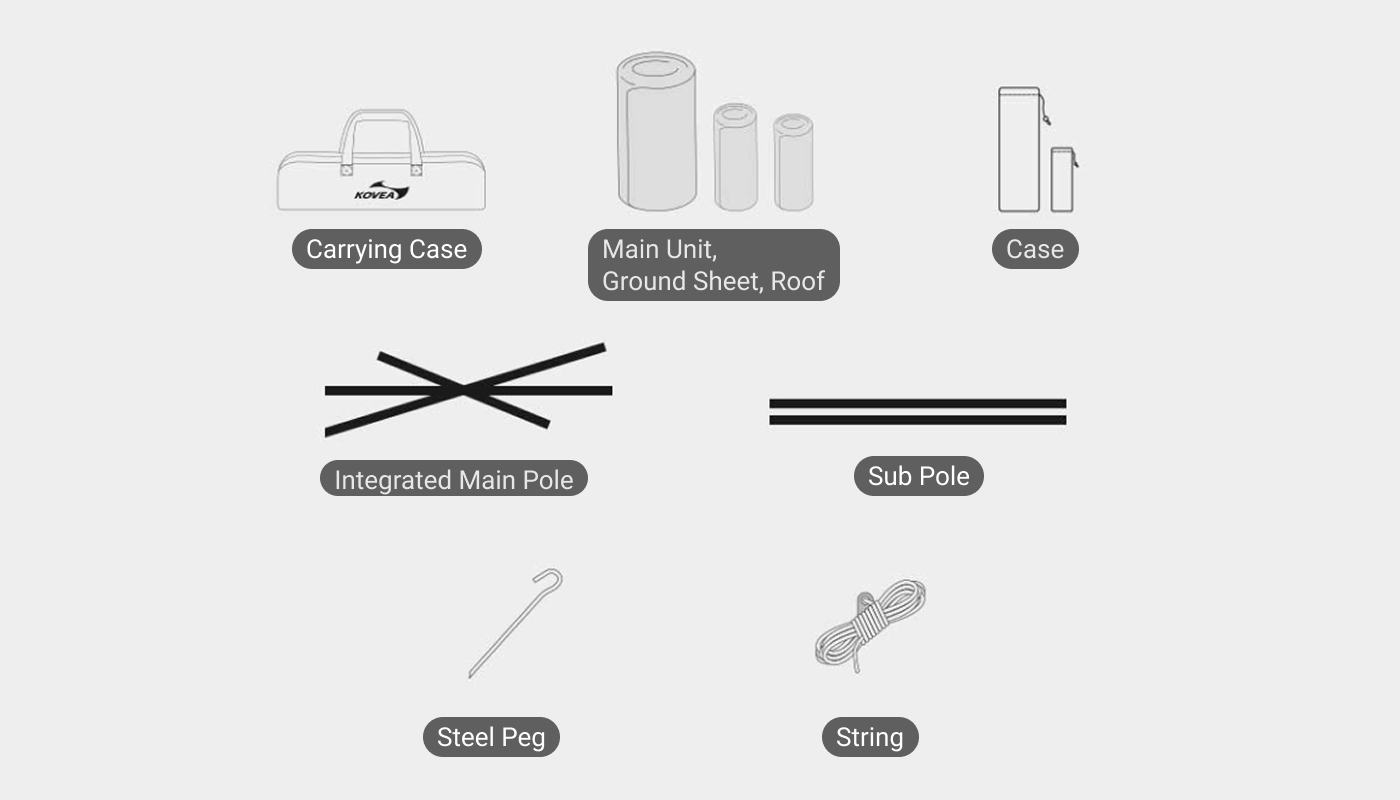Package Includes: Carrying Case * 1, Main Unit * 1, Ground Sheet * 1, Roof * 1, Integrated Main Pole * 1, Sub Pole * 2, Steel Peg * 10, Guy Line * 2
