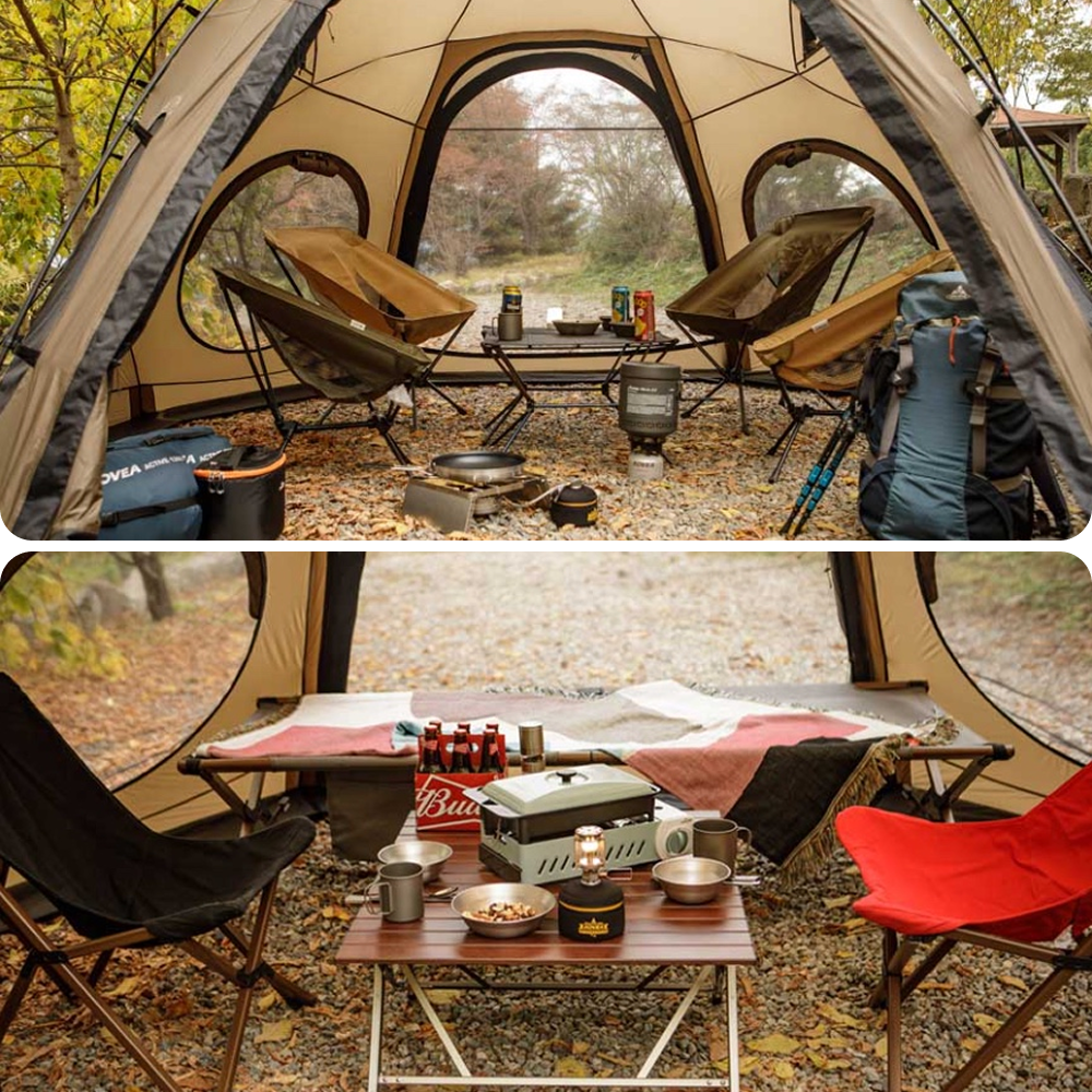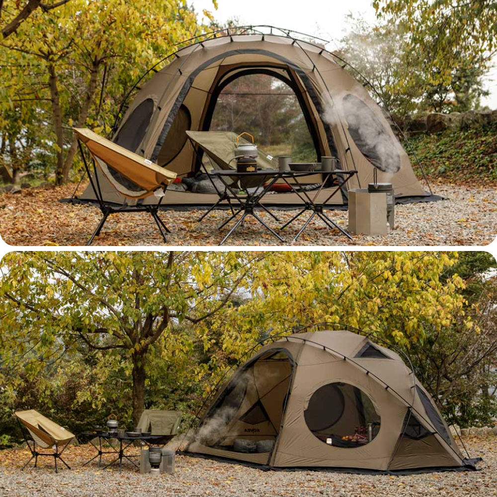 The shelter can be set up in a "Low Mode," utilizing the shelter structure alone without the groundsheet. This configuration maximizes openness to nature, making it ideal for creating an ambient space for activities like enjoying a campfire.