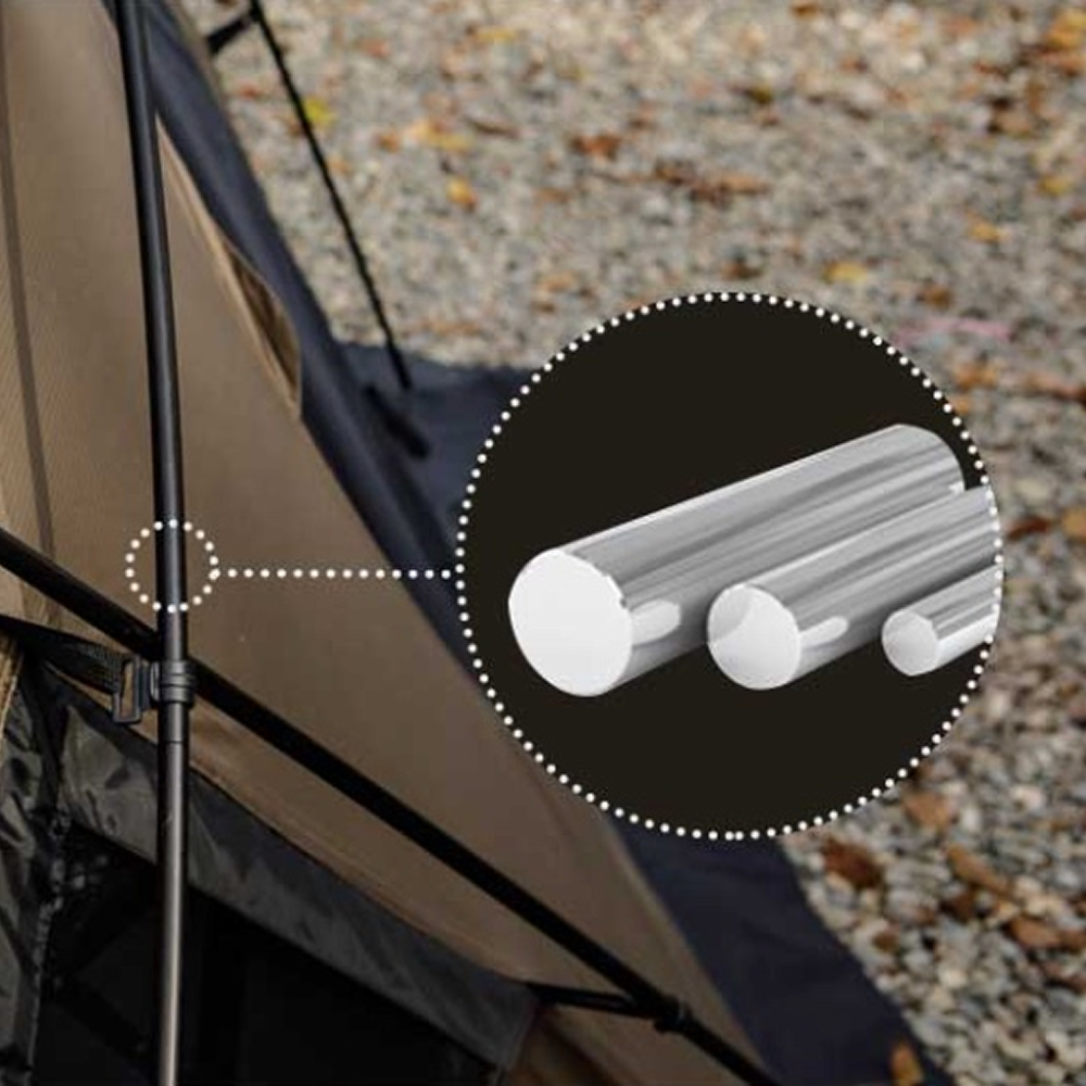 The shelter is supported by main poles constructed from high-strength Duralumin, a material renowned for its exceptional durability and low weight. This combination ensures a robust structure while significantly enhancing ease of portability and setup.