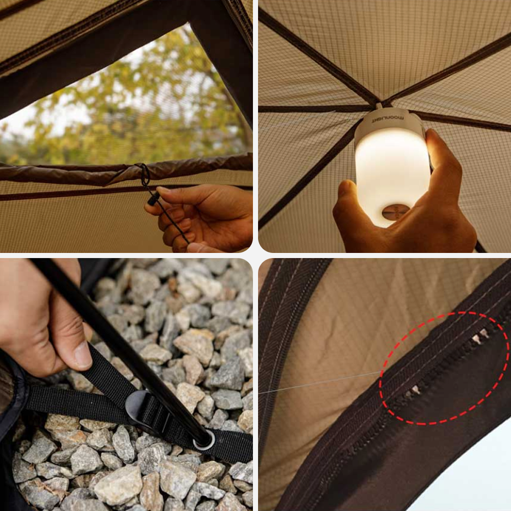 Top-level ventilation ensures optimal air circulation for a comfortable interior. An internal lantern hook simplifies lighting, and pole connection eyelets support a stable pitch. Furthermore, a separate zipper expansion line is integrated for future use with upcoming docking tents and TPU clear windows, maximizing the shelter's long-term utility.