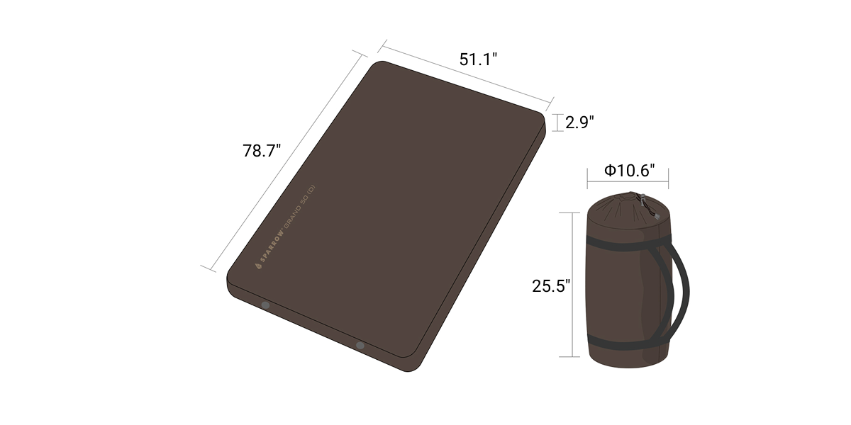 The Grand 50 - Double is a premium double-size outdoor mat with 50D stretch fabric, 2.9"(7.5cm) high-density PU foam, 3D sidewalls, TPU coating, non-slip base, and roll-up storage for ultimate comfort and convenience.