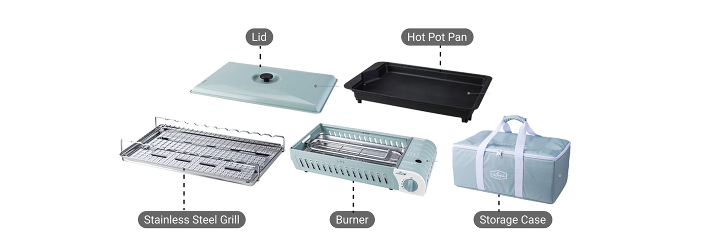 Package Includes: Lid * 1, Stainless Steel Grill * 1, Hot Pot Pan * 1, Pot Support * 1, Main Body (Burner) * 1, Storage Case * 1