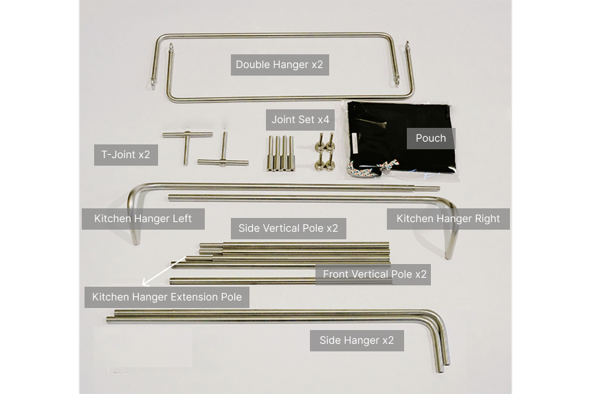 Default package includes: Kitchen Hanger (Left, Right), Double Hanger * 2pc, Side Hanger * 2pc, Front Vertical Pole * 2pc, Side Vertical Pole * 2pc, Unit Extension Pole* 1pc, Joint Set * 4 Set (bolt and nut), T-Joint * 2pc , Pouch