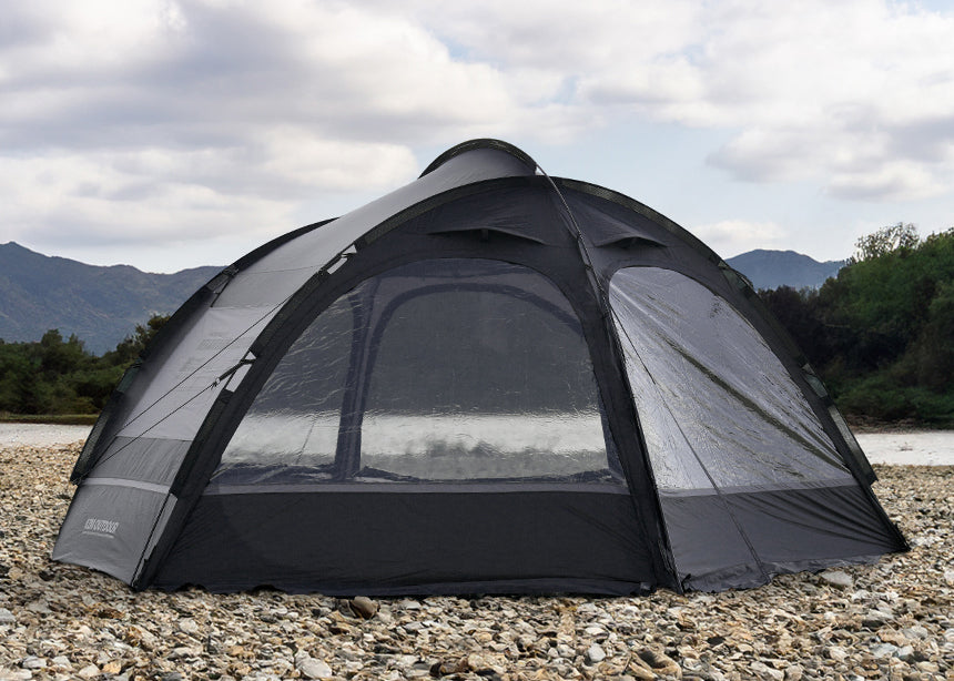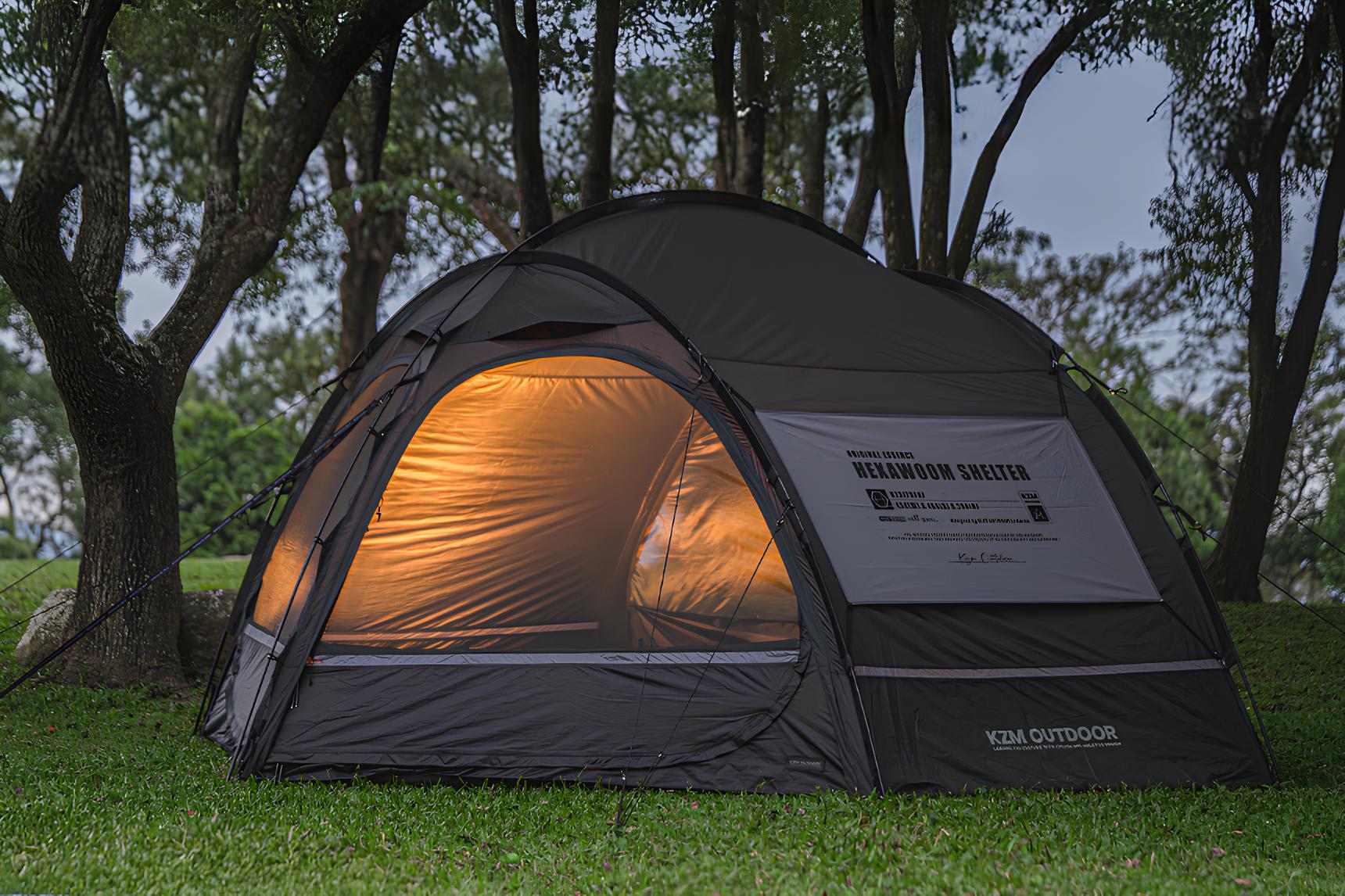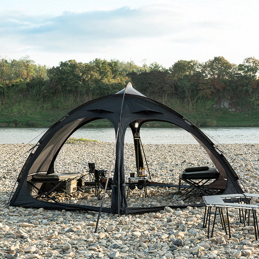 Hexaum Shelter features a unique hexagonal design with four large doors for wide-open views and a spacious interior. Quick three-pole setup and weather-ready construction keep you comfortable outdoors.