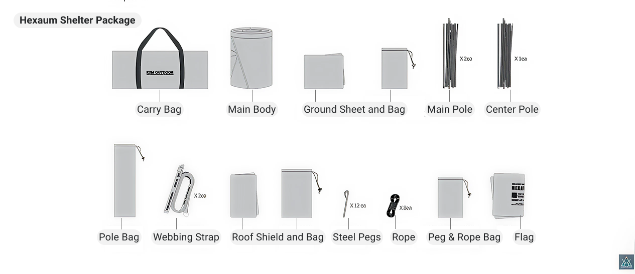 • Hexaum Shelter Package : Carry Bag * 1, Main Body * 1, Ground Sheet * 1, Ground Sheet Bag * 1, Main Pole * 2, Center Pole * 1, Pole Bag * 1, Webbing Strap * 1, Roof Shield * 1, Roof Shield Bag * 1, Steel Peg * 12, Rope * 8, Peg & Rope Bag * 1, Flag * 1