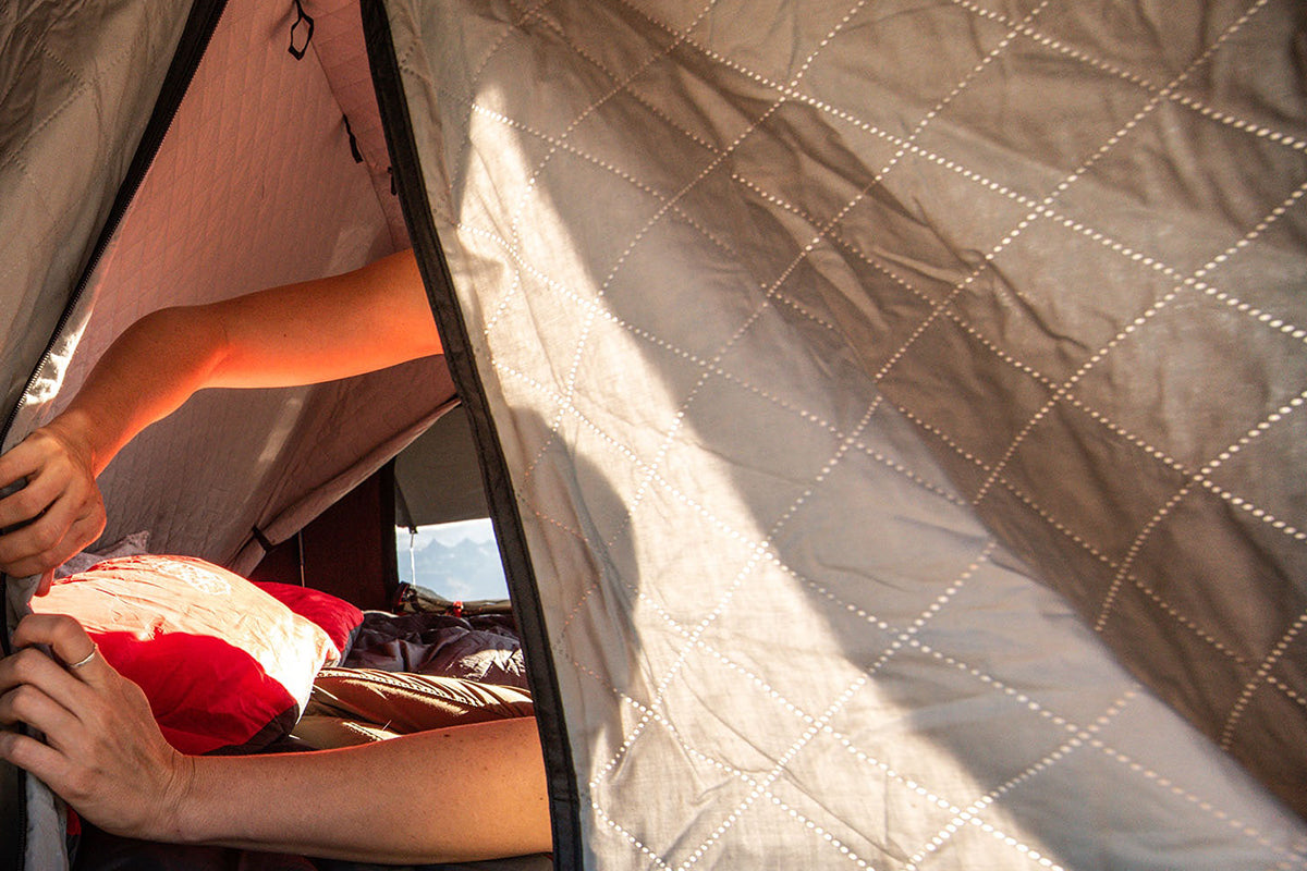 Our new High Frequency welded seams give the Insulation Tent a clean look while creating the highest quality stitch possible. Our quilted, double-layered roof top tent insulation keeps the warm in and the cold out. Made of a breathable poly-cotton material, this inside tent blocks drafts of air and retains body heat for cozy nights in your iKamper RTT.