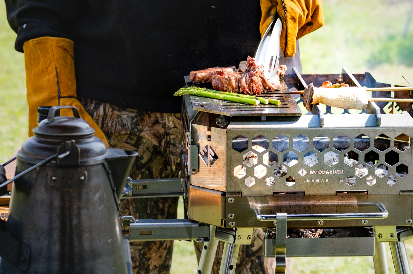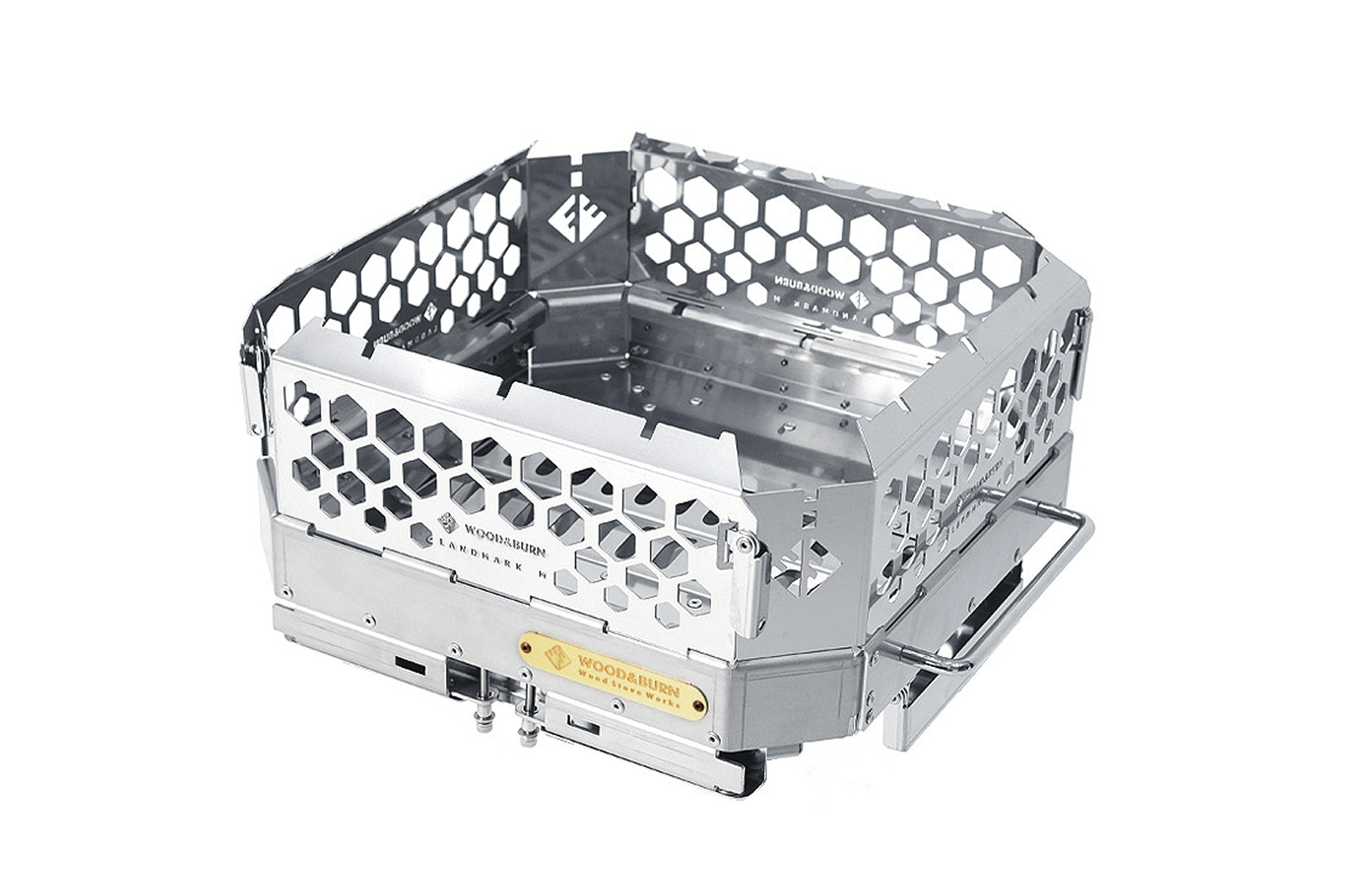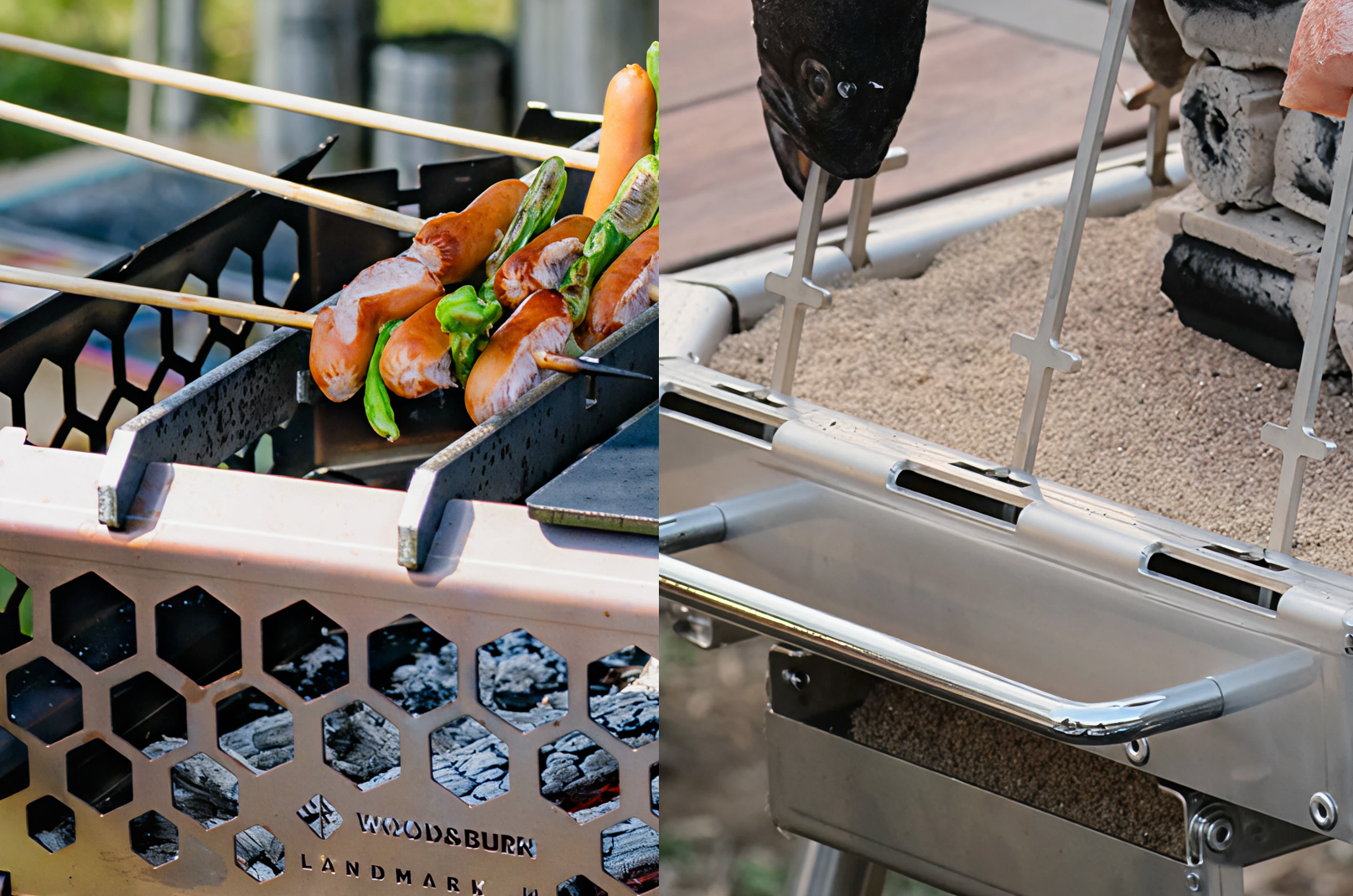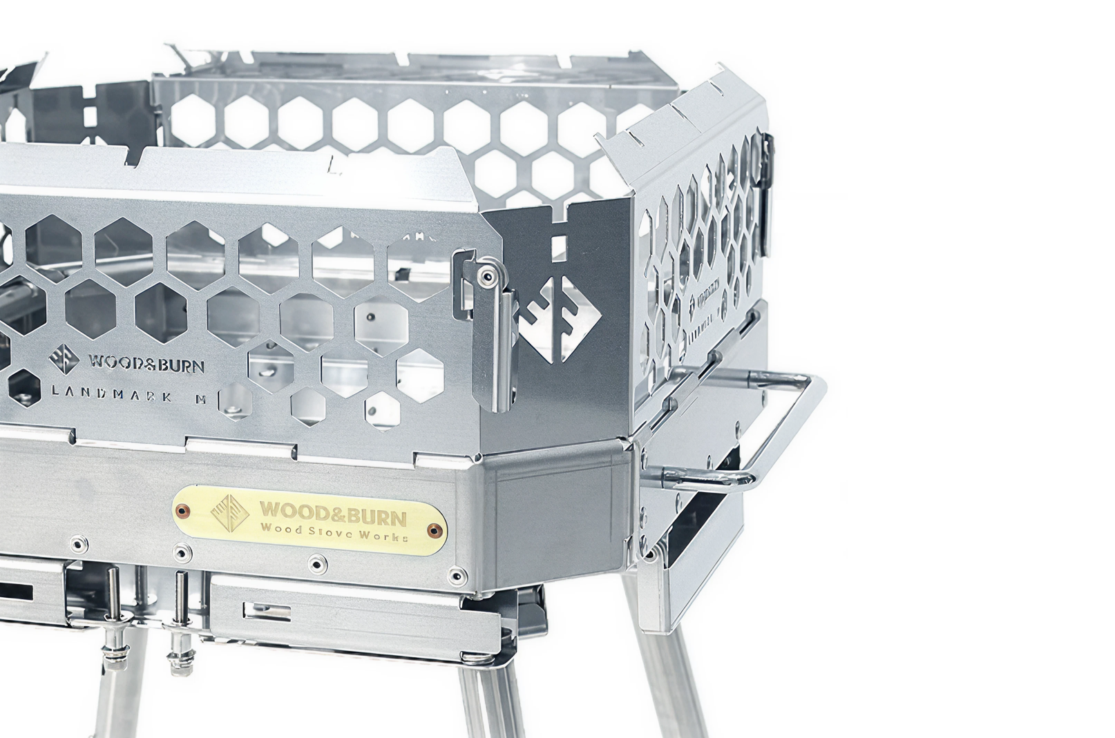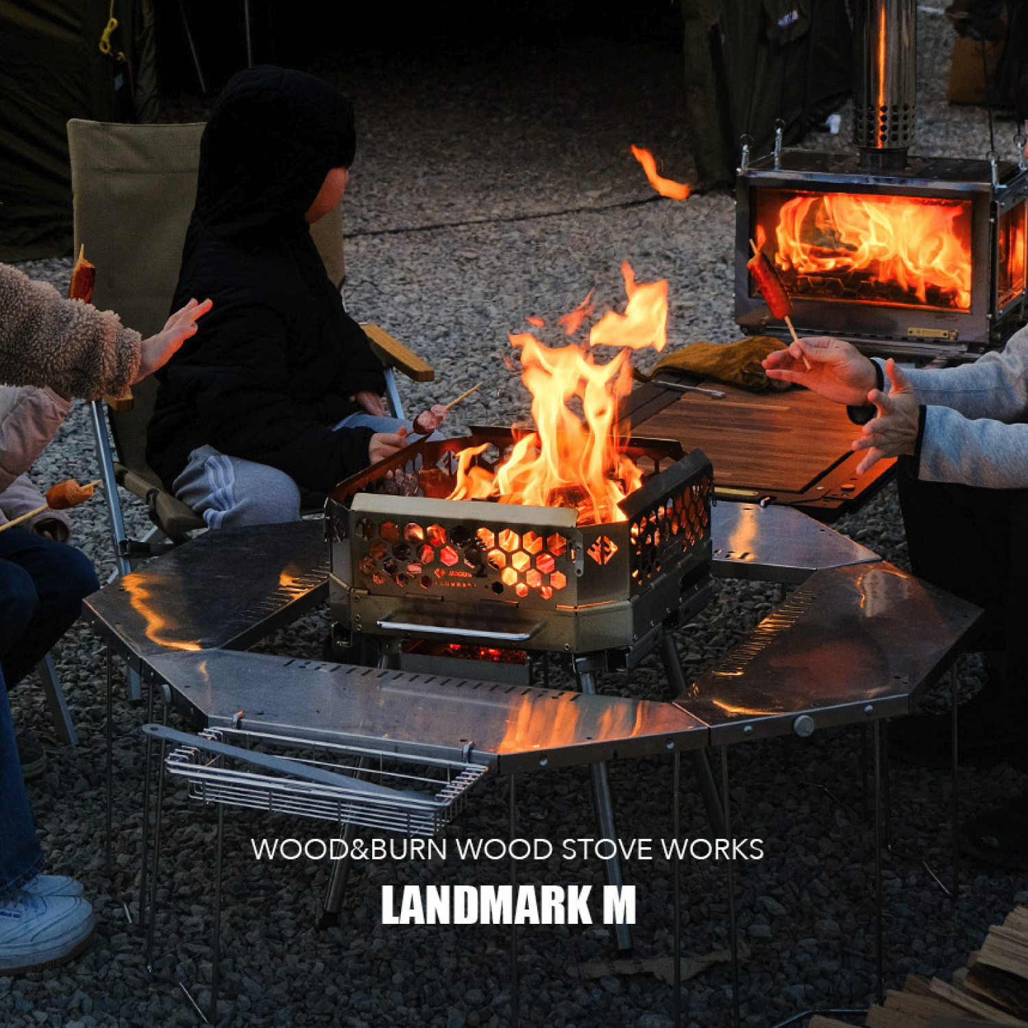 A premium multi-functional fire pit equipped with height adjustment, expansion options, and table compatibility. The Landmark M, the first in the Landmark series to feature height adjustment, allows users to set various heights depending on the chosen legs. It seamlessly integrates with IGT Systems, providing a more convenient and stable camping environment. Featuring accessories like iron plate griddles, crossbars, and skewers, it functions as a complete fire pit for both cooking and campfire enjoyment. Designed with Wood & Burn's engineering technology, the Landmark M ensures a comfortable camping experience all year round.