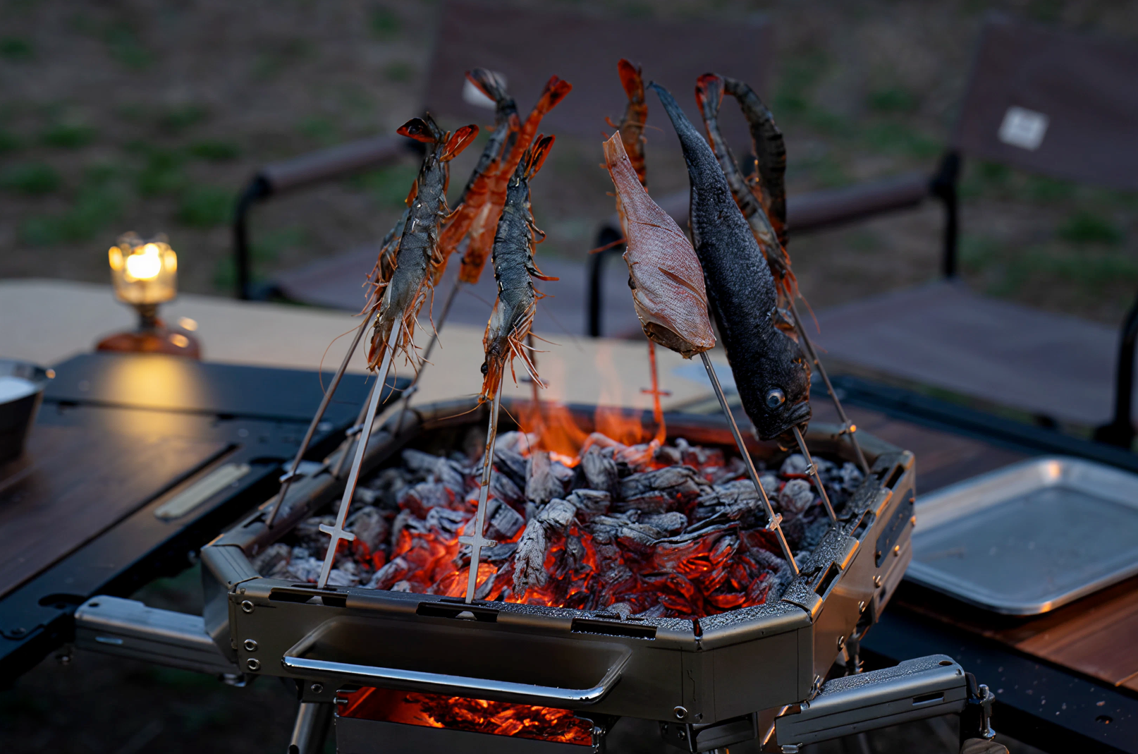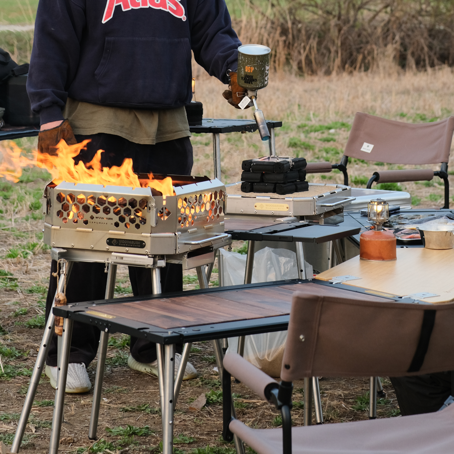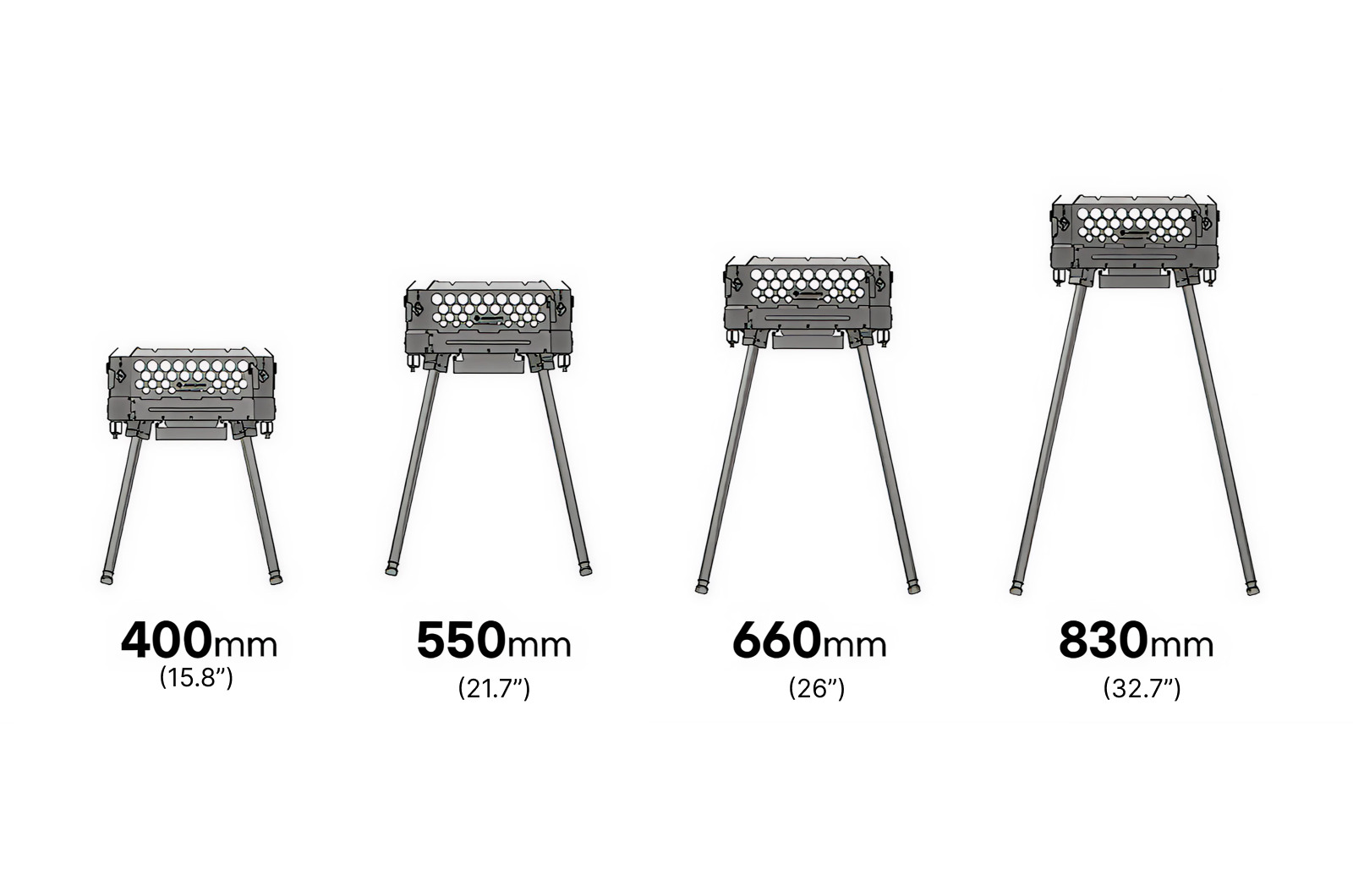 Compatible with IGT legs, offering 4 adjustable height options (400mm / 550mm / 660mm / 830mm). Suitable for both seated and standing positions, adapting to various camping environments. Unlike conventional fire pits, it supports most adjustable legs available on the market (legs are not included).