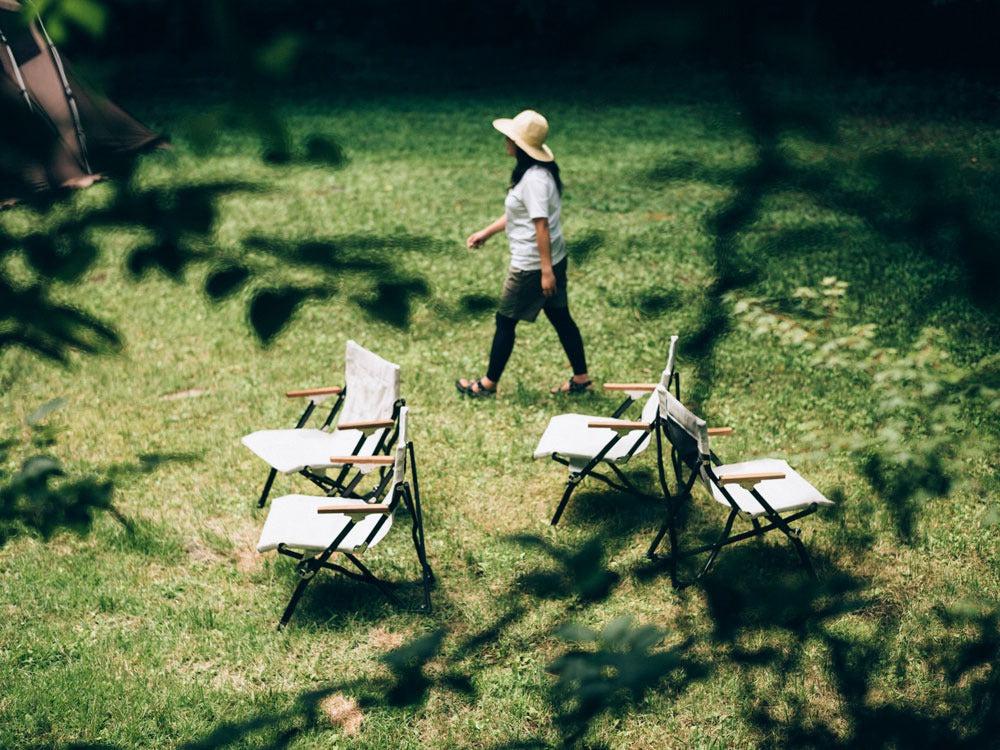Conçue au Japon, la chaise de plage basse de luxe est dotée d'accoudoirs en bois naturel et d'un siège en toile.