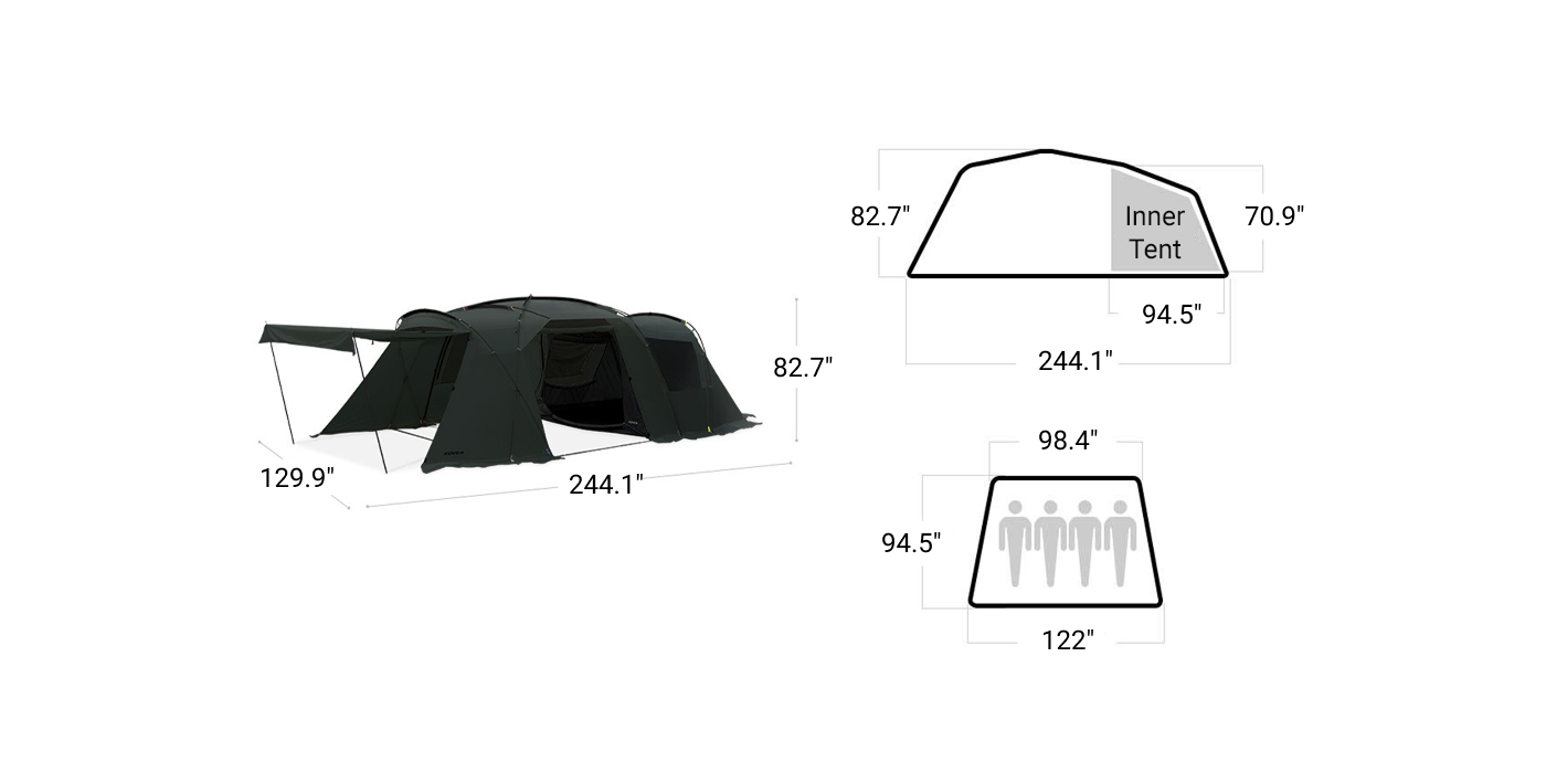 • Inner Tent: 122(98.4)"(W) × 94.5"(D) × 70.9"(H)