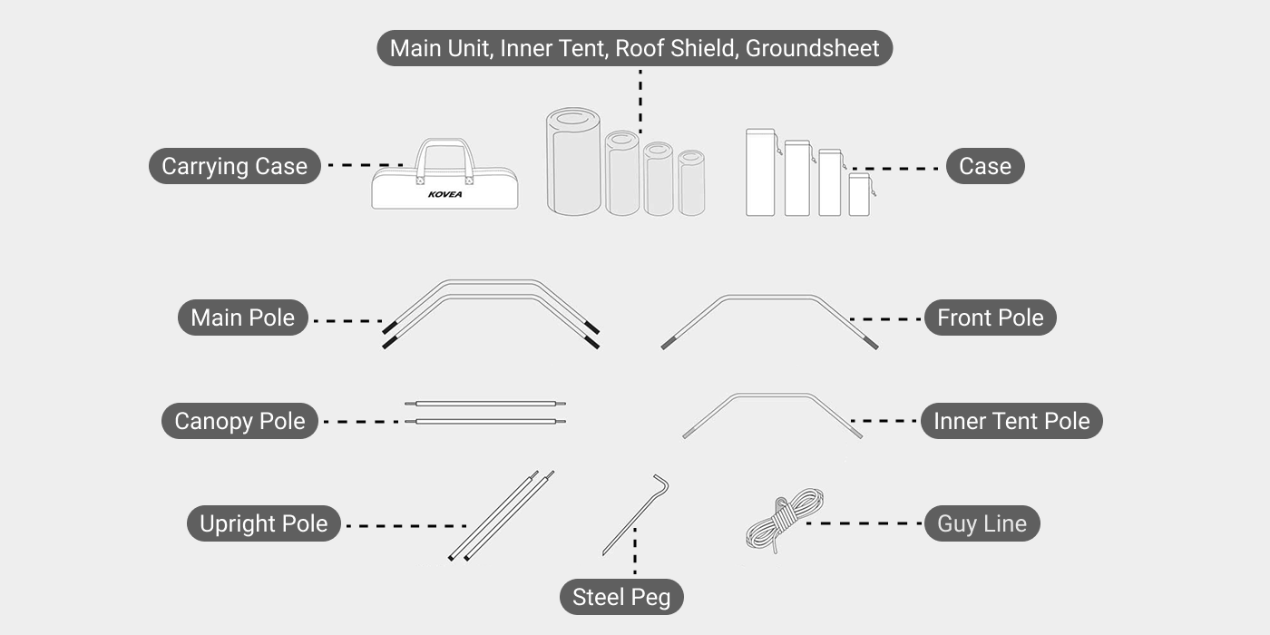 Package Includes: Main Unit * 1, Inner Tent * 1, Roof Shield * 1, Groundsheet * 1, Main Poles * 2, Front Pole * 1, Inner Tent Pole * 1, Canopy Poles * 2, Upright Poles * 2, Steel Pegs * 28, Guy Lines * 14, Pole Repair Kit * 1, Carrying Case * 1