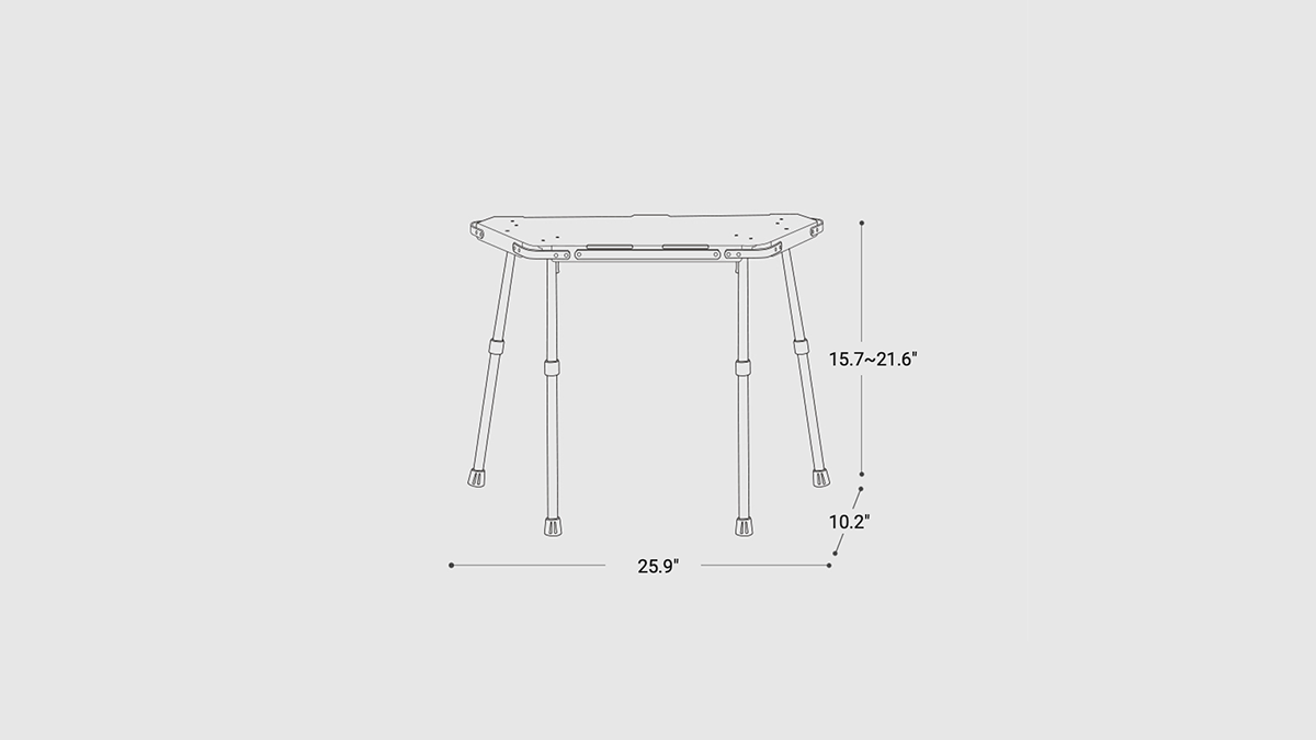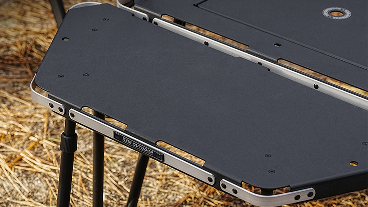 The One Table TRS is a modular aluminum camping table with adjustable legs and accessory slots, designed to connect multiple units for versatile setups, including a fire pit table configuration.