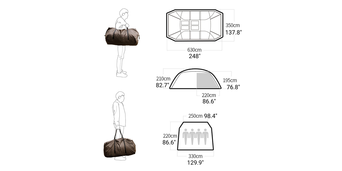 • Inner Tent: 129.9(98.4)"(W) × 86.6"(D) × 76.8"(H)