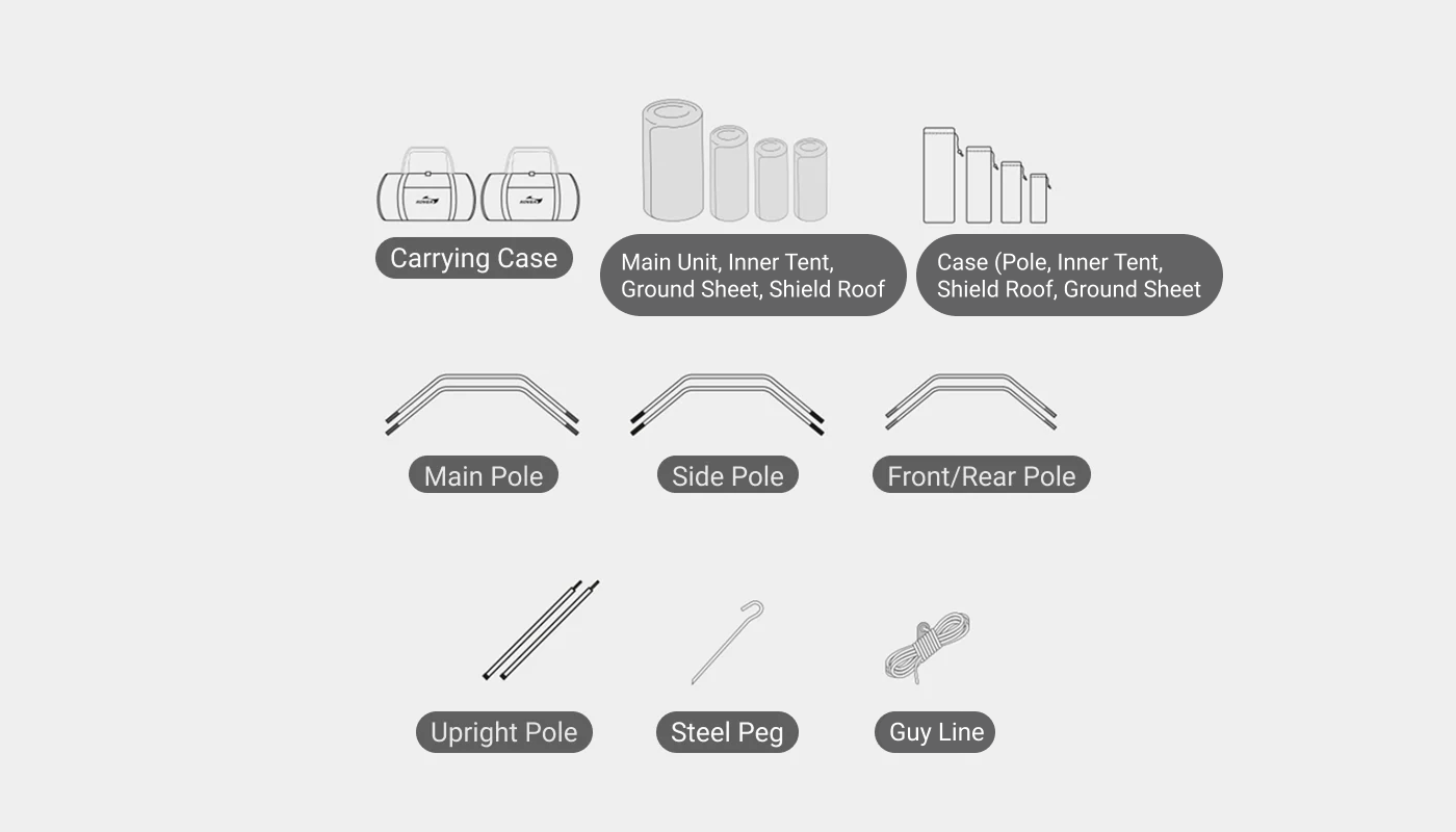 Package Includes: Carrying Case * 2 , Main Unit * 1, Inner Tent * 1, Shield Roof * 1, Ground Sheet * 1, Main Pole * 2, Side Pole * 2, Front/Rear Pole * 2, Upright Pole * 2, Steel Peg * 35, Guy Line * 12, Pole Repair Kit * 1