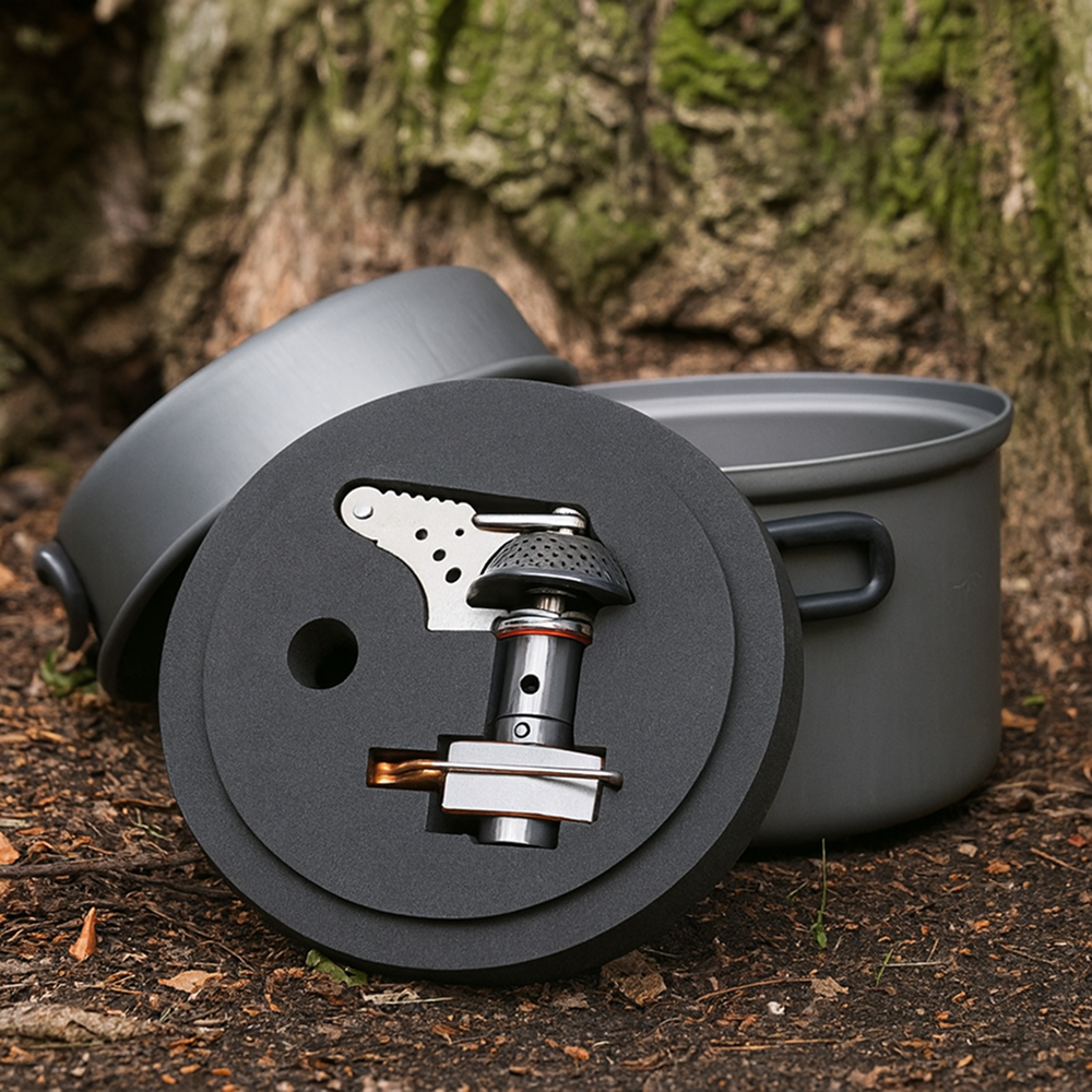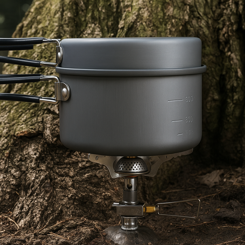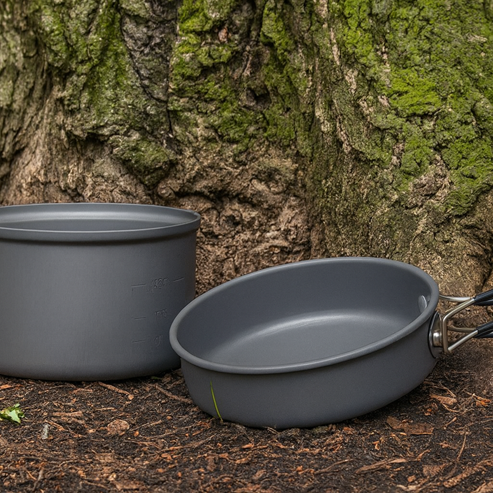 Ultralight aluminum cook set with a versatile lid-pan, perfect for 1–2 campers.