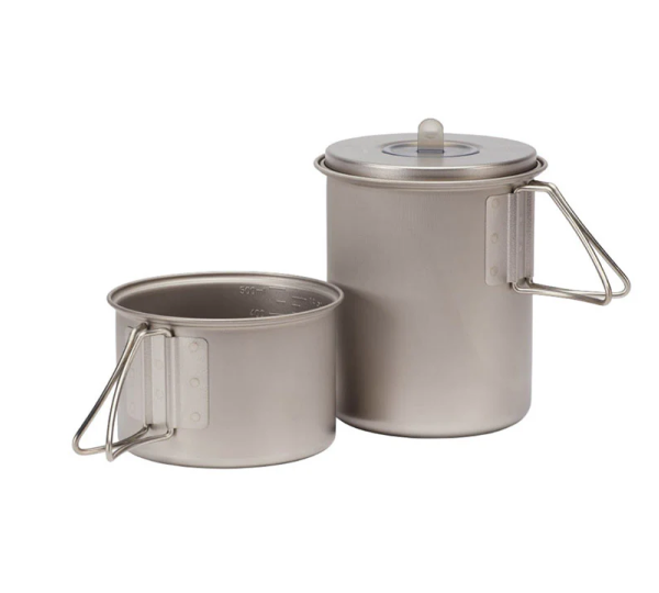 This cook-set comprises a nesting pot and cup made from titanium, engineered for solo back-country use. Its ultra-light construction and compact design make it suitable for minimalist outdoor dining.