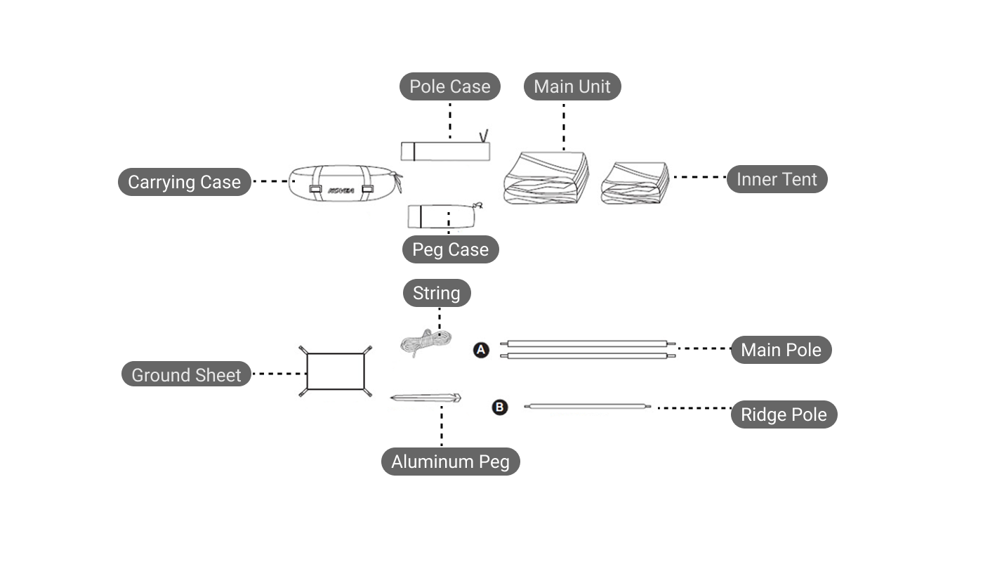 Package Includes: Carrying Case * 1, Pole Case * 1, Peg Case * 1, Main Unit * 1, Inner Tent * 1, Ground Sheet * 1, Guy Line * 4, Aluminum Peg * 12, Main Pole * 2, Ridge Pole * 1