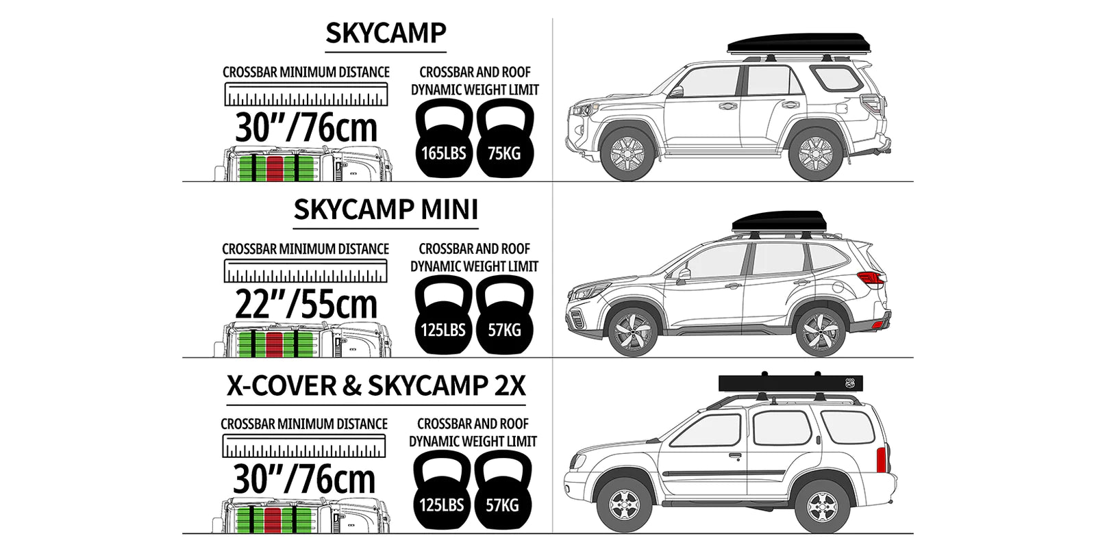Dynamic weight refers to the weight supported by your vehicle when it is in motion and your roof top tent is closed, while static weight refers to the weight supported by your vehicle when it is stopped and the tent is deployed. The dynamic weight requirements for your vehicle and cross bars / rack system to accommodate our roof top tents is essentially equal to the weight of the tent itself.