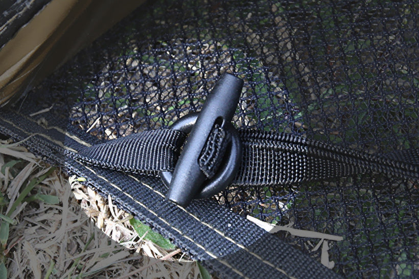 The toggle fastening system allows for quick and easy attachment to the shelter’s loops.