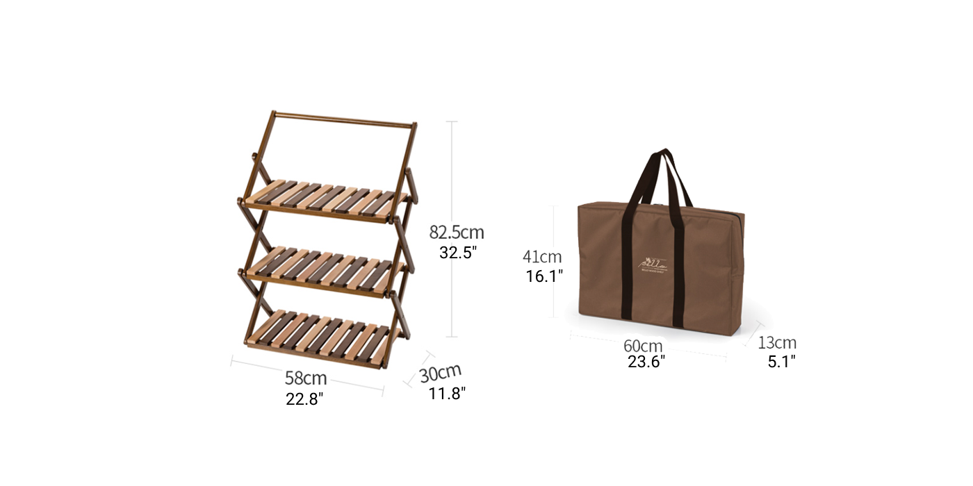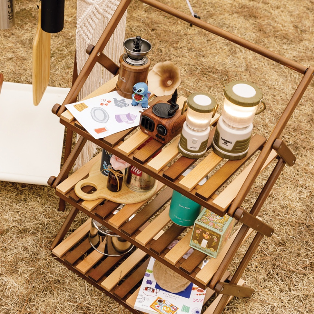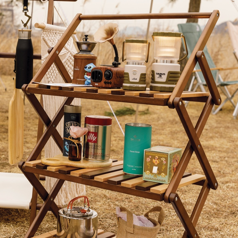 A high-end 32-inch tall camping shelf crafted from durable natural beechwood, featuring an integrated hanging bar and multiple tiers. Supporting up to 66 lbs, its collapsible design ensures a perfect balance between robust storage and convenient portability.