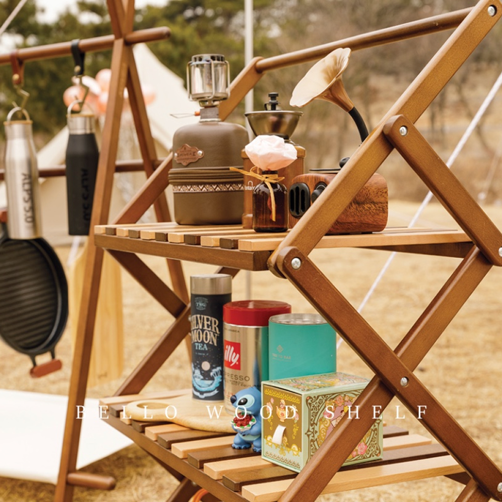 Elevate your outdoor organization with the Bellowood Shelf. The warm, two-tone beechwood texture creates a cozy interior vibe, whether in your living room or at a scenic campsite. With its unique hanging bar for easy access to gear and a sturdy frame that folds in seconds, it’s the ultimate statement piece for the discerning camper.