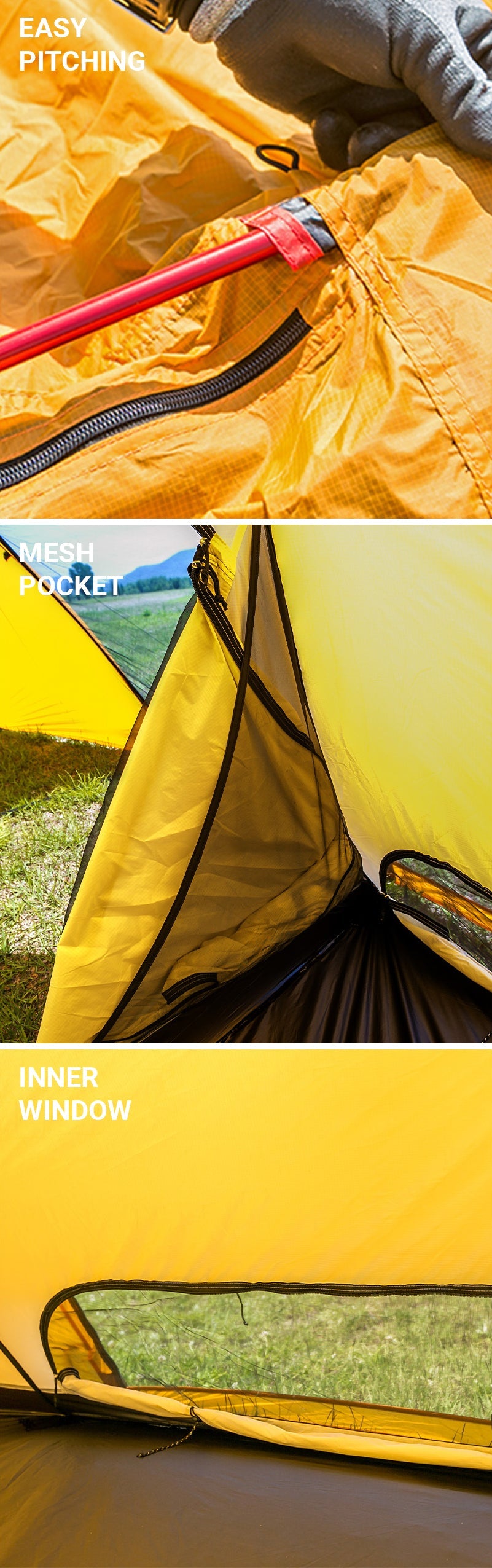 • Tent Body: Nylon 20D Riptstop PU/SIL 2,000mm