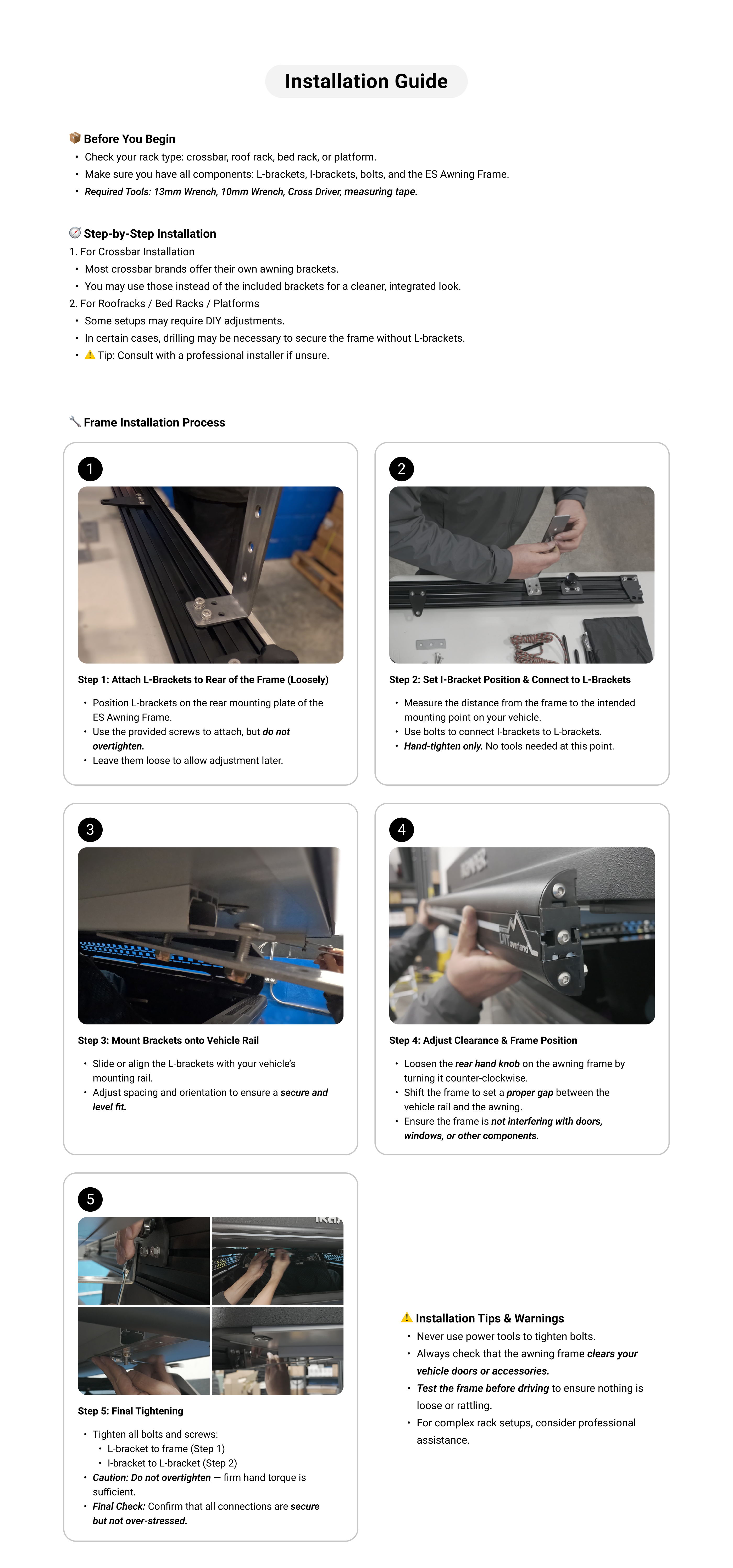✦NOTE: For custom roof rack mounting, drilling may be necessary depending on the roof rack. The included bolts are hex bolts sized M8×30. To mount the LNT 280 Awning, both the 2000 and 1300 ES Awning Frames are required.