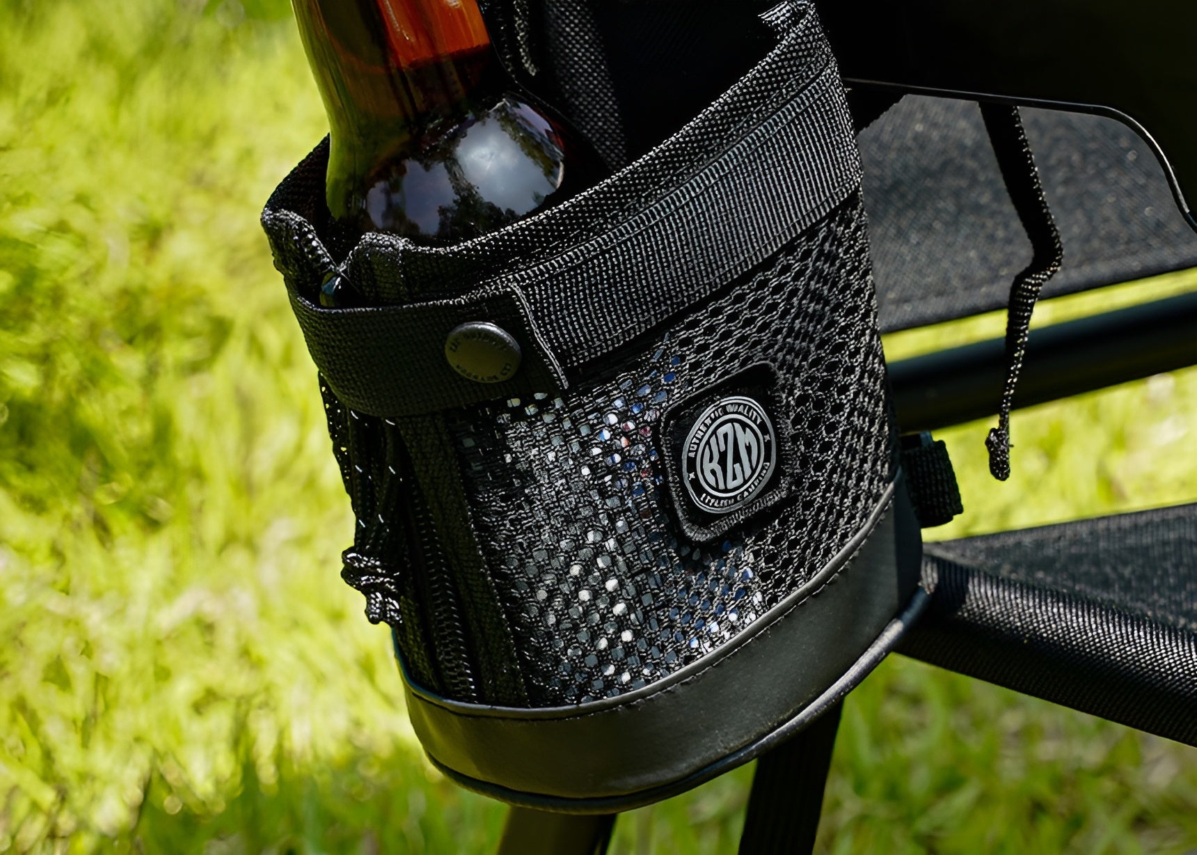 Three sides are made from tough 600D polyester mesh that prevents water from pooling and allows excellent airflow. The front features both a snap button and zipper, making it easy to store cups and bottles of various sizes securely.