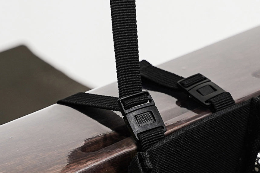 Its durable mesh body and buckle strap easily attach to chairs, tables, or other frames for convenient storage anywhere.