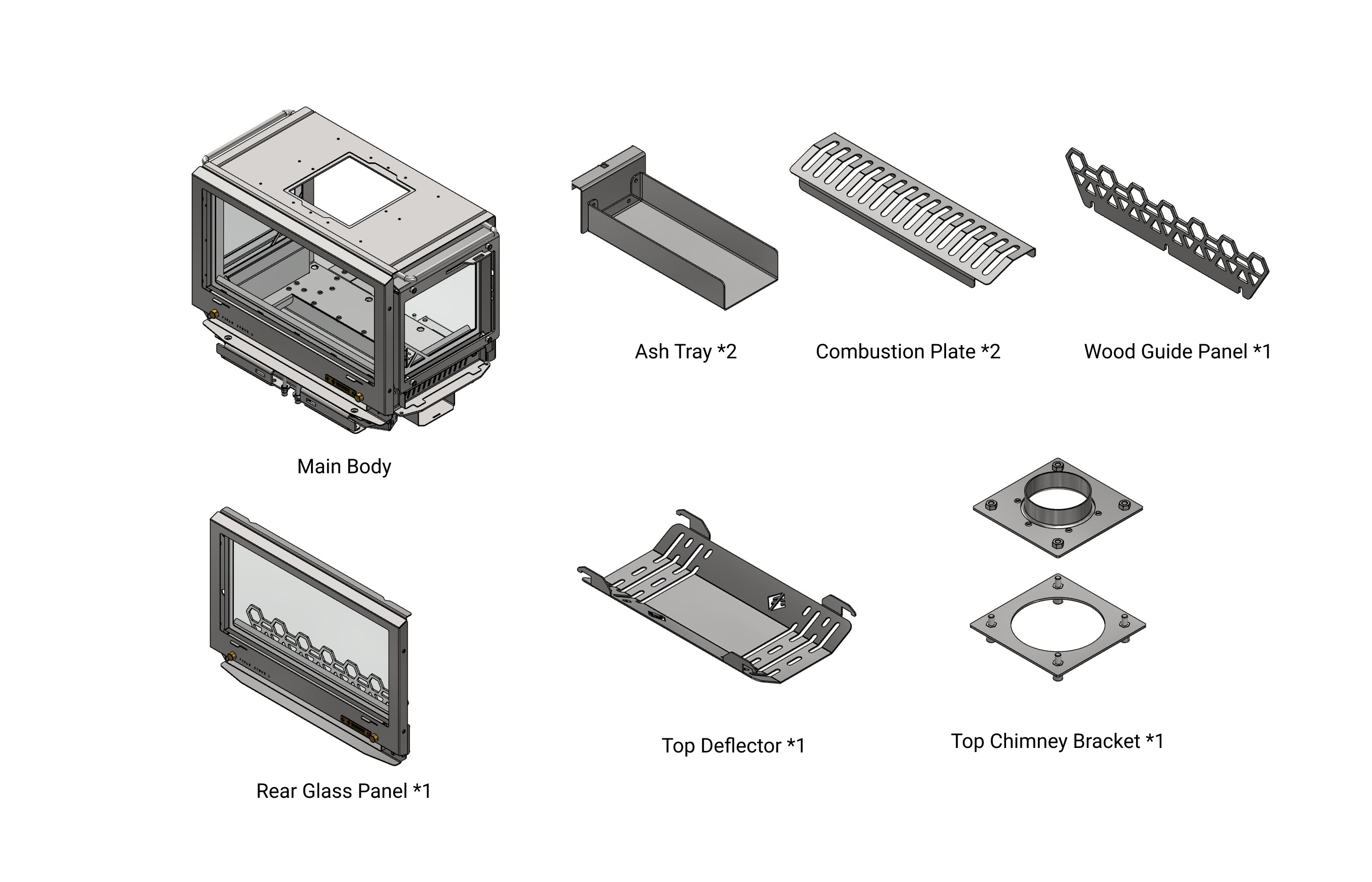Base Module Set: Main Body *1, Ash Tray *2, Combustion Plate *2, Wood Guide Panel *1
