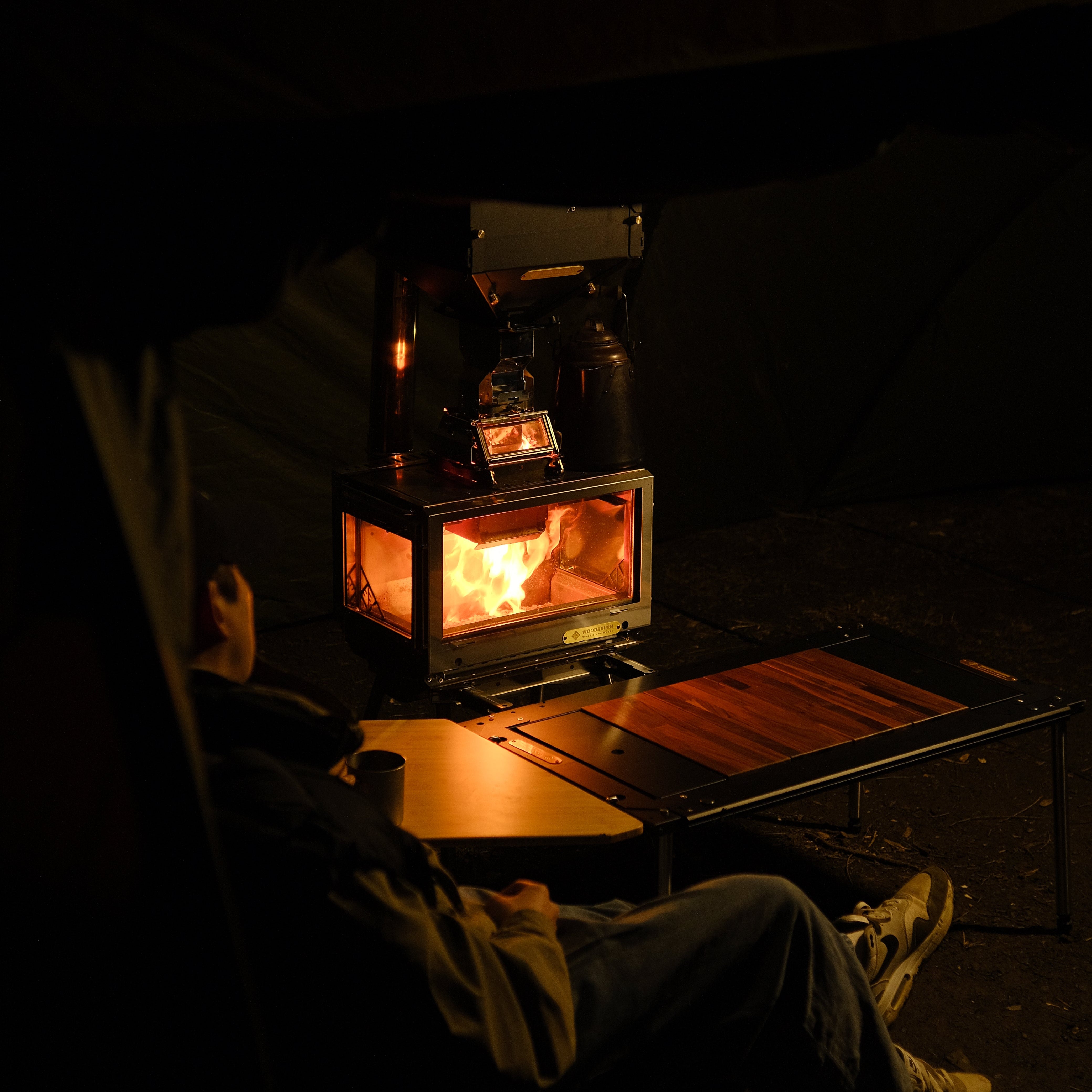 With a simple module swap, the Field Stove can be used as a 4-sided glass fire viewer or as a wood-burning stove (using firewood or pellets). In spring, summer, and fall, the 4-sided glass design allows you to enjoy the flames and cozy warmth from any angle. In winter, switch to pellet burner mode for overnight heating.