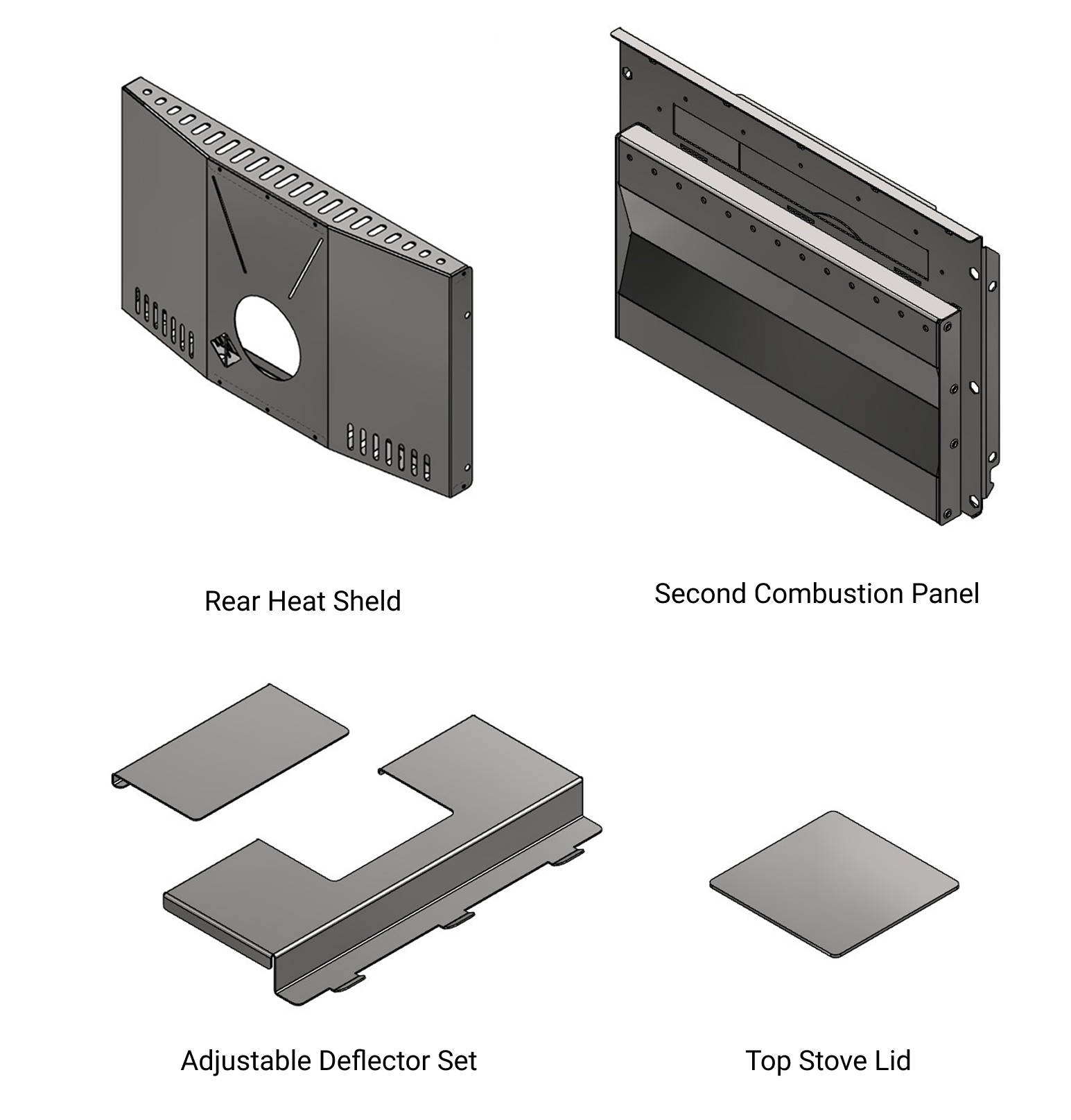 Field Stove Pellet Module Set: Second Combustion Panel *1, Rear Heat Shield *1, Adjustable Deflector Set *1, Top Stove Lid *1