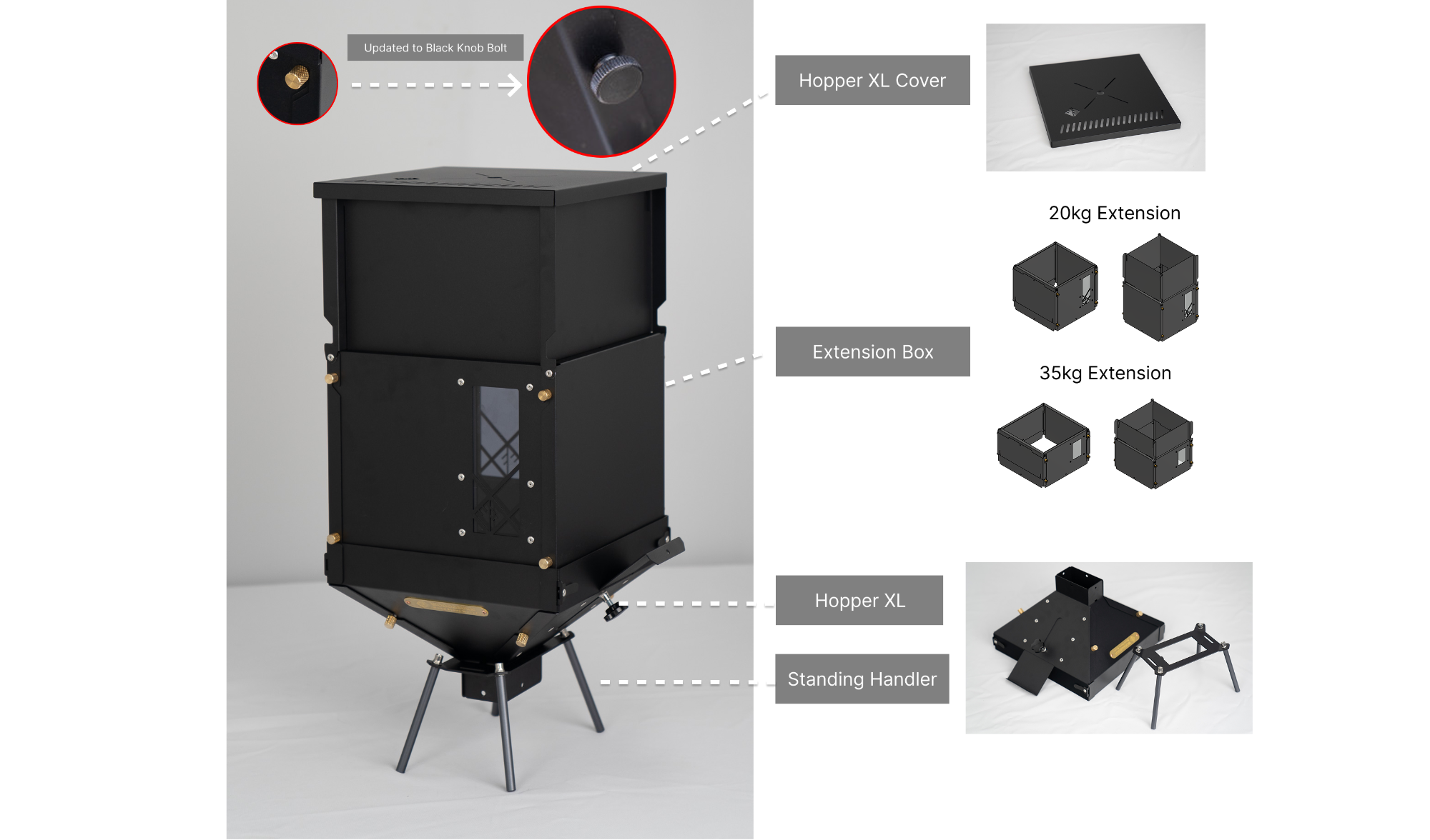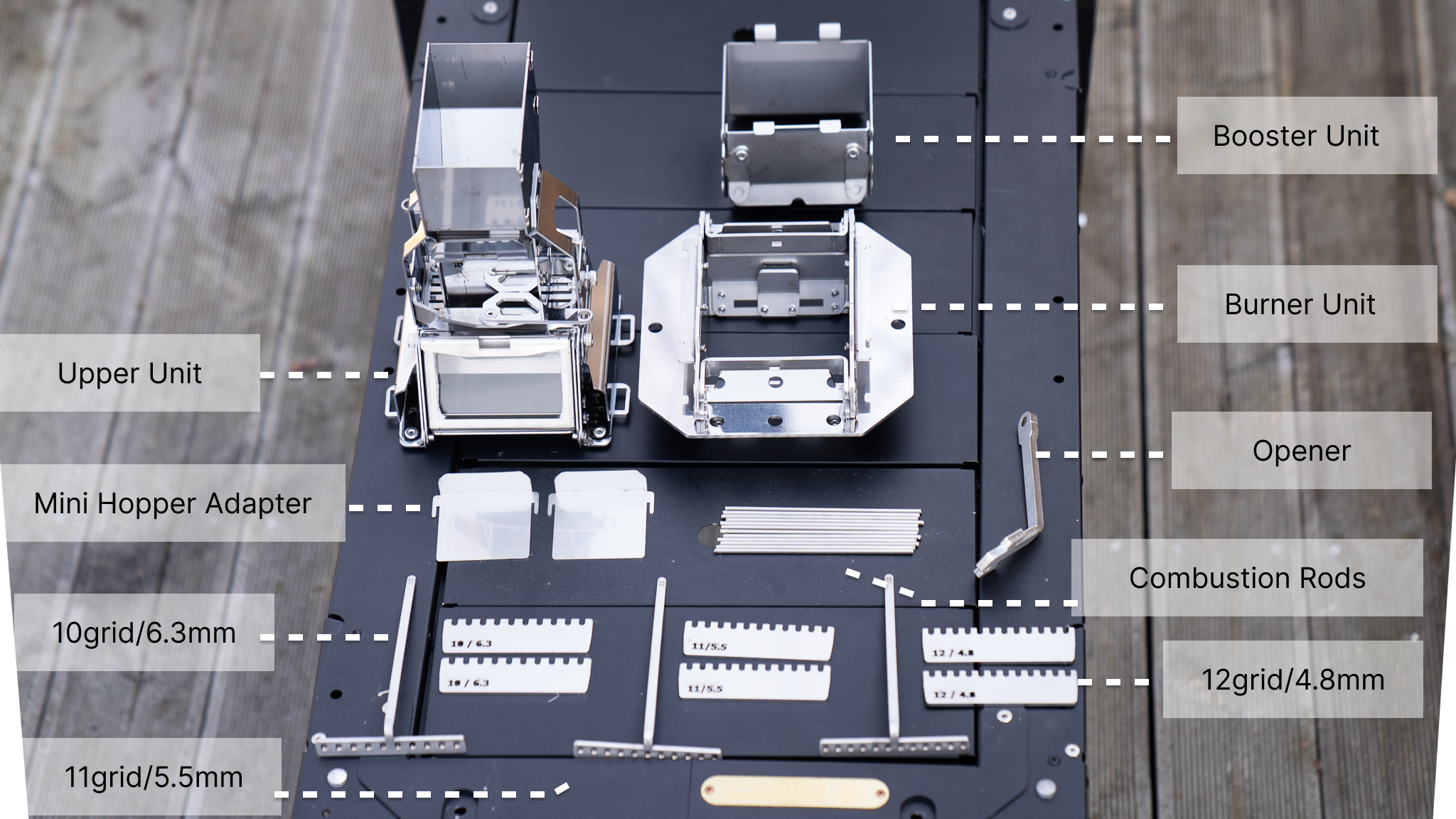 Base Module Set: Main Body *1, Ash Tray *2, Combustion Plate *2, Wood Guide Panel *1