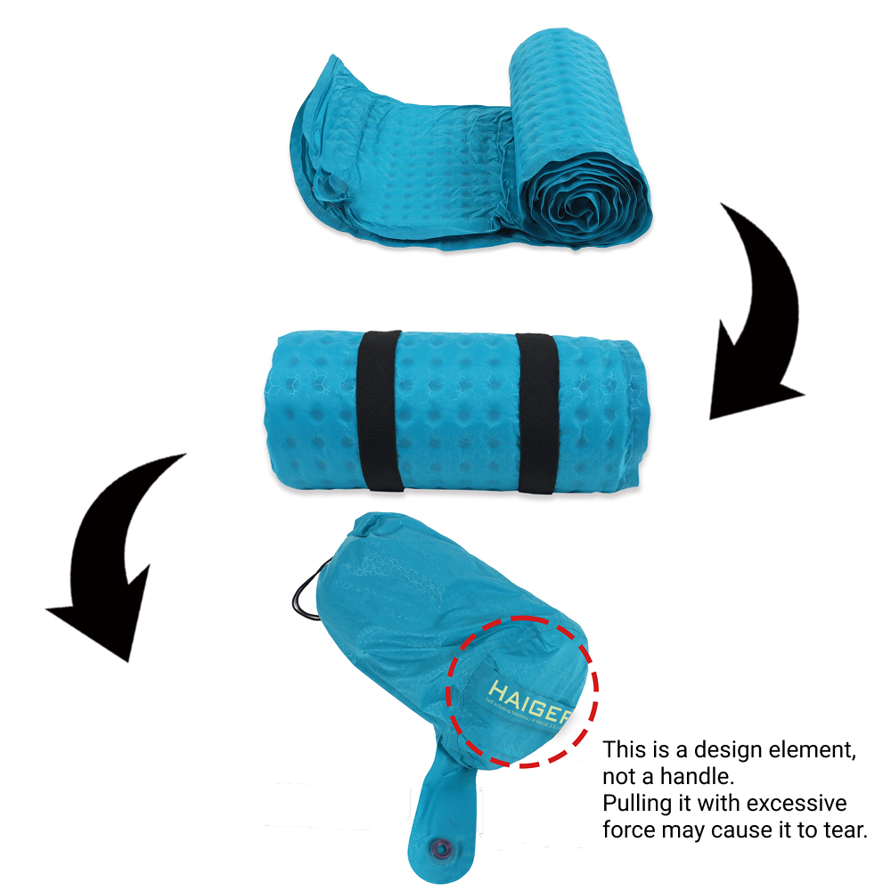 The Haiger mat is a lightweight, compact backpacking mat featuring high-density PU foam, wave-cut surfaces, durable TPU coating, 2-way valve, and a pump-bag style storage bag for easy setup and portability.