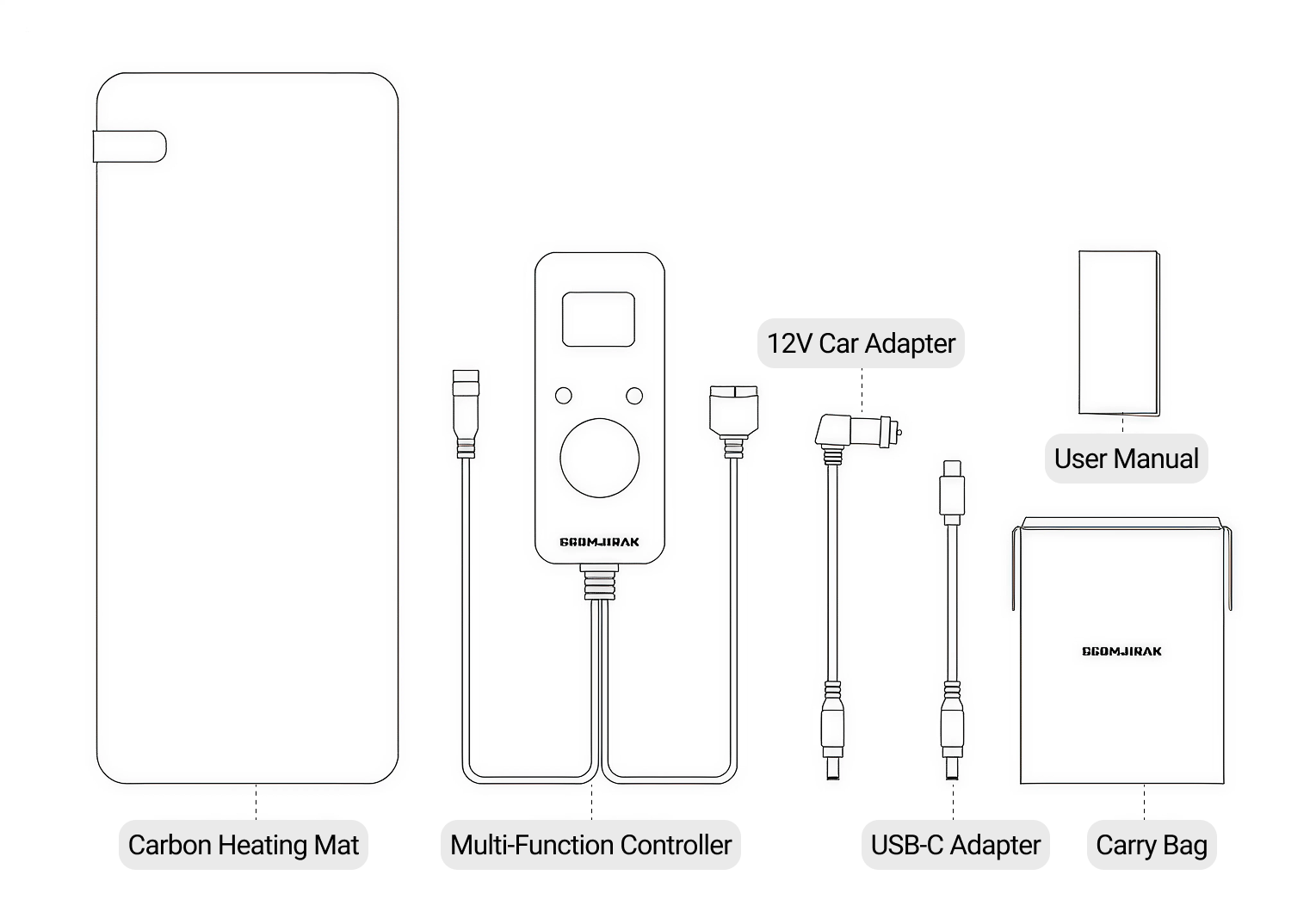 Default package includes: Carbon Heating Pad *1, Multi-Function Controller *1, 12V Car Adapter *1, USB-C Adapter *1, Carry Bag *1, User Manual *1