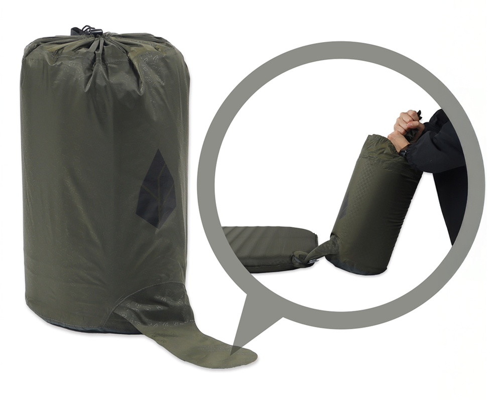 The storage bag is designed in a pump-bag style, allowing for quick air inflation of the mat. Additionally, the bag is PU-coated for water resistance, making it suitable not only for pumping but also for storing various items.