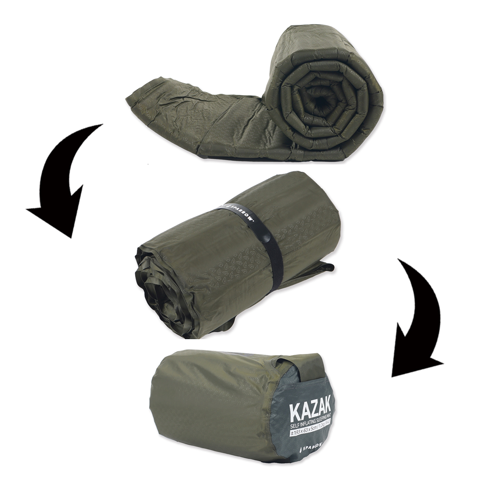 The Kazak is a slim, compact backpacking mat with high-density PU foam, TPU coating, double-sided fabric, and flat valve design, offering lightweight comfort for outdoor sleep and easy roll-up storage.