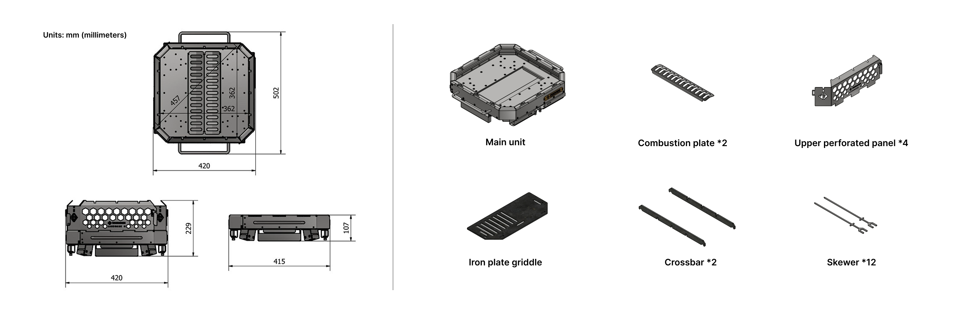 Landmark M Body, 2 Combustion Plates, 4 Upper Perforated Panels, 1 Storage Bag, 1 Iron Plate Griddle, 2 Crossbars, 12 Skewers