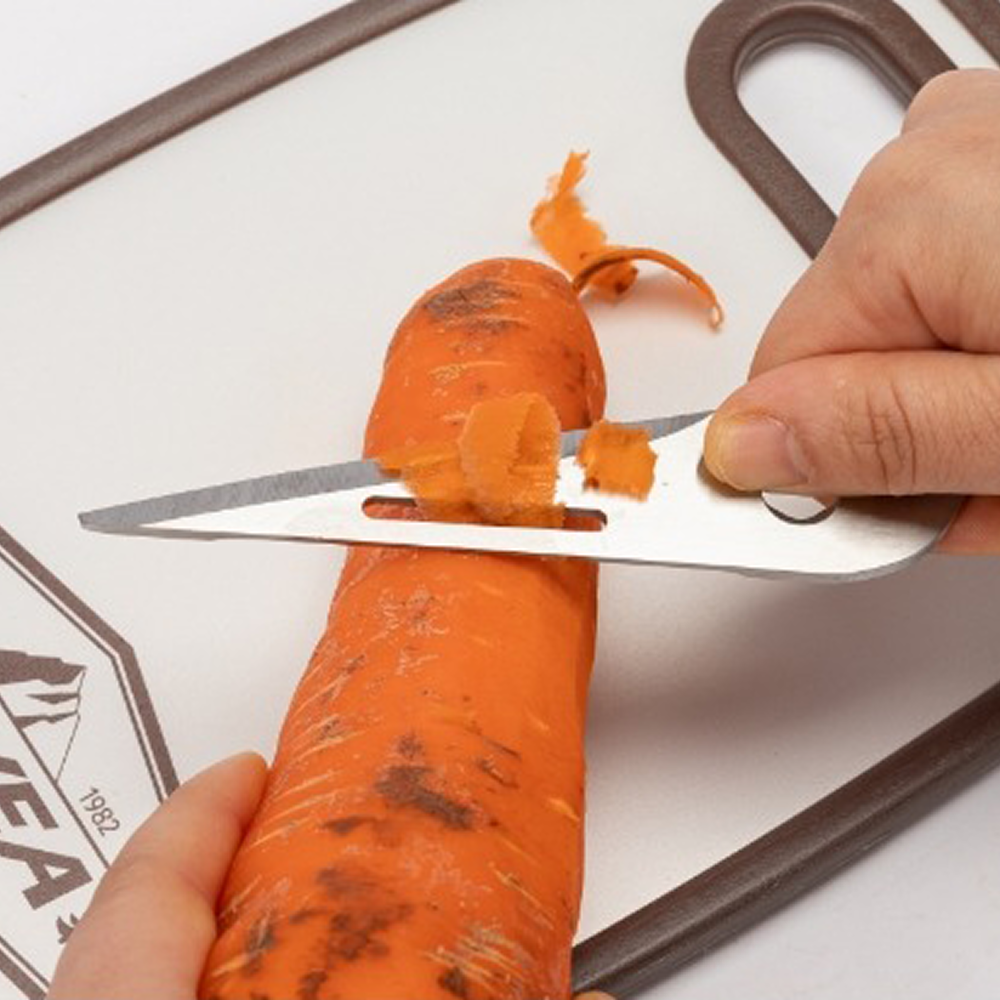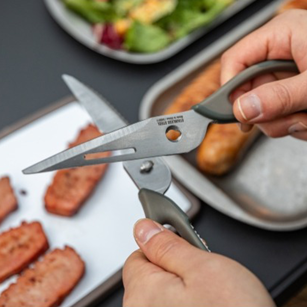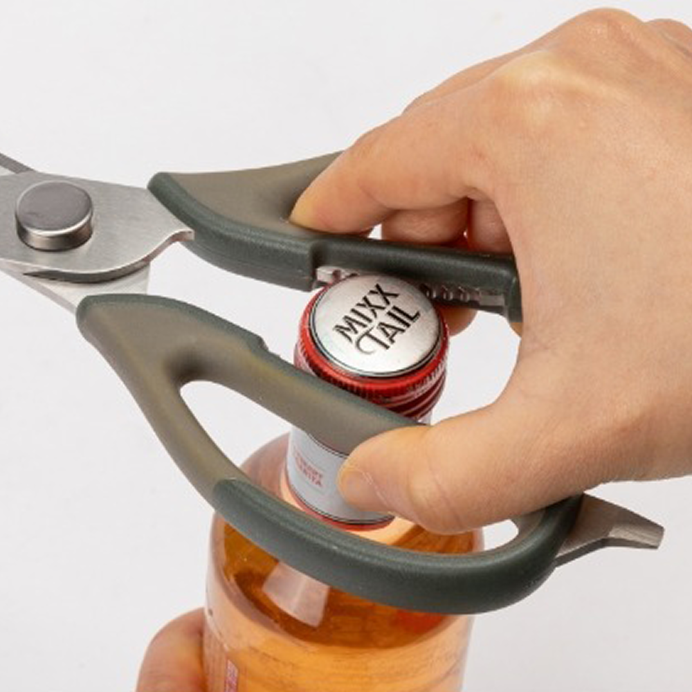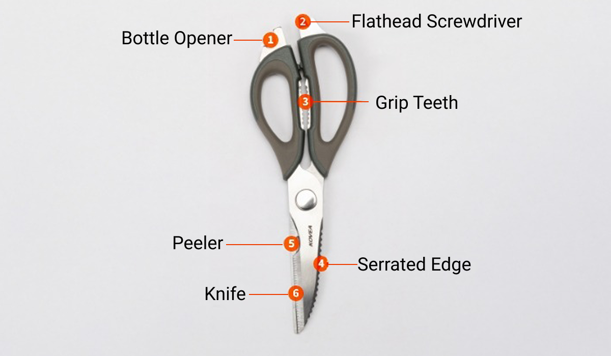 More than just scissors—this tool integrates six practical functions in one: bottle opener, screwdriver, nut grip, serrated blade, peeler, and knife. From kitchen prep to outdoor cooking, it’s a compact all-in-one essential designed for convenience and versatility.