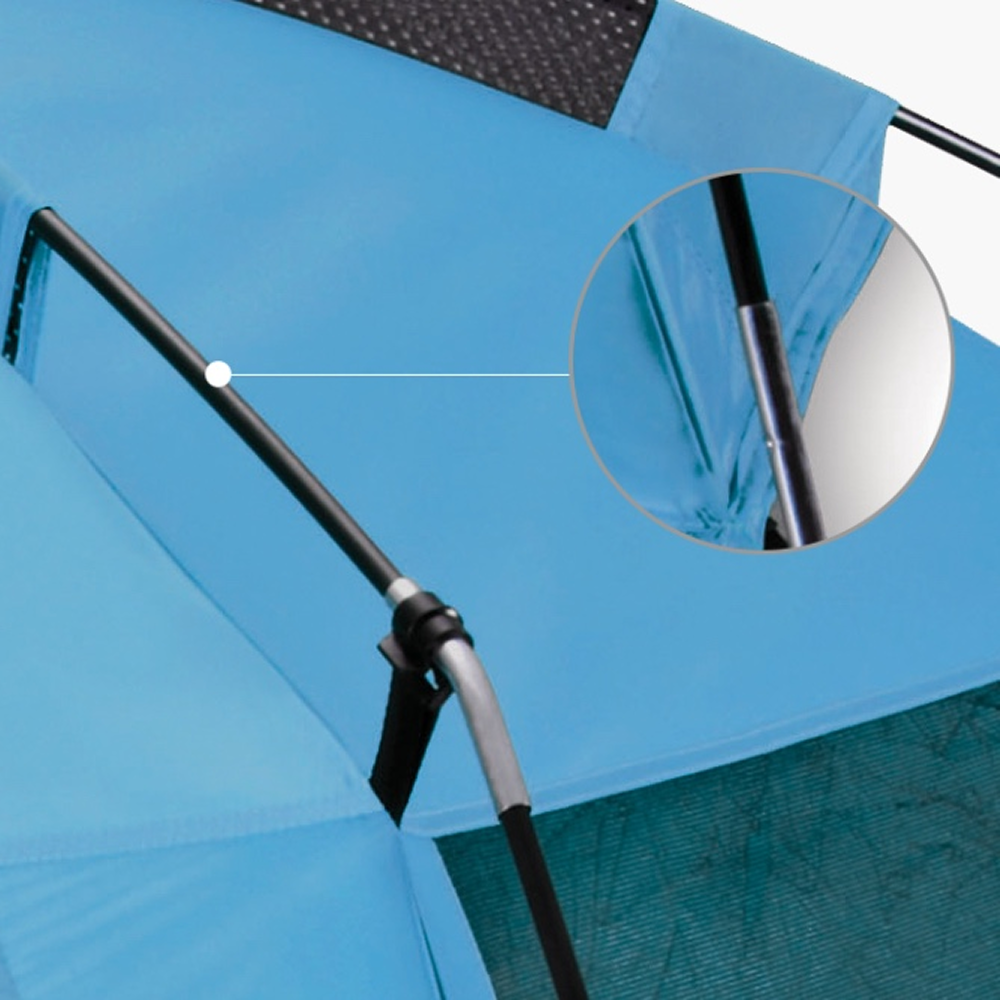 The shelter utilizes highly elastic and durable Fiberglass poles for its frame. These lightweight poles reliably support the structure, ensuring it remains stable and resilient even against beach winds.