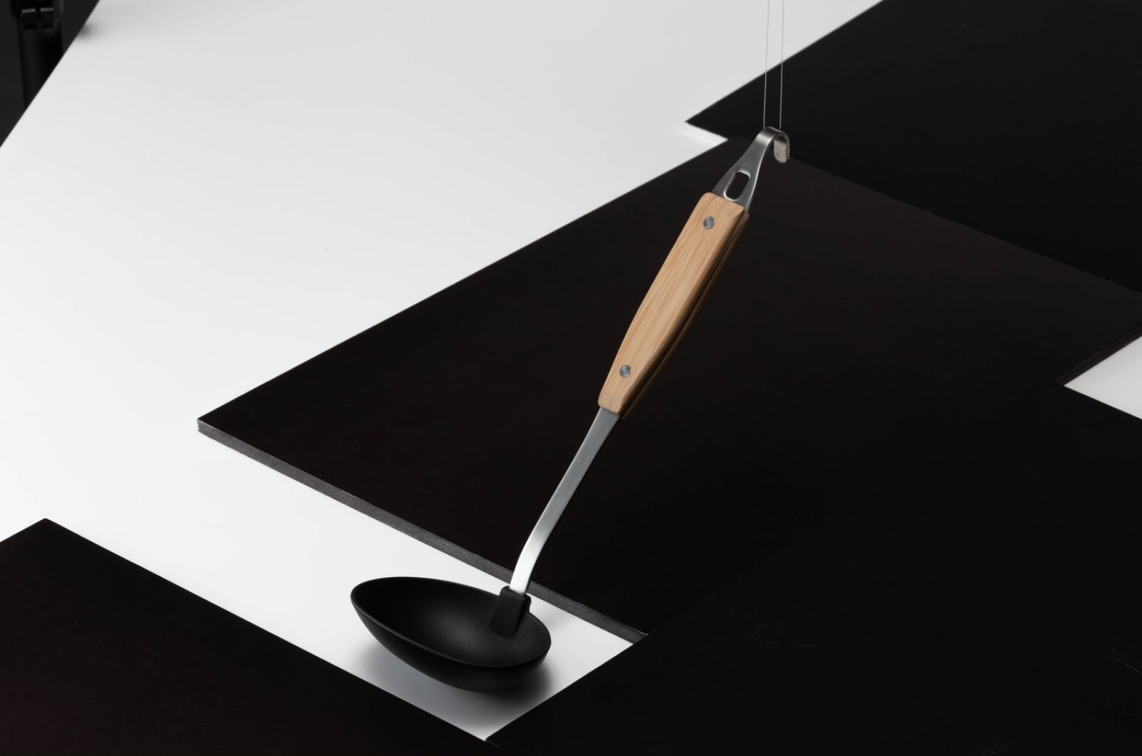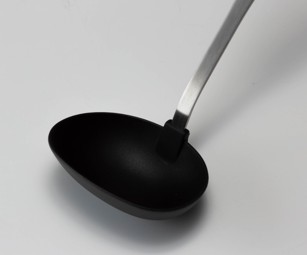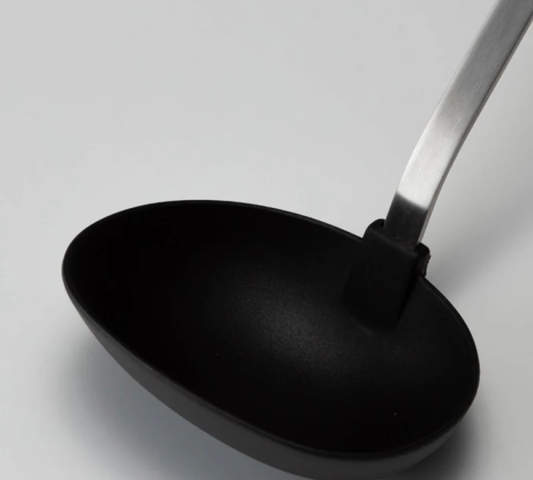 This ladle features a wide nylon head combined with a bamboo-wrapped stainless steel handle that mitigates heat transfer during cooking. It is designed for outdoor and camp kitchen use and includes a hooked end for hanging storage.