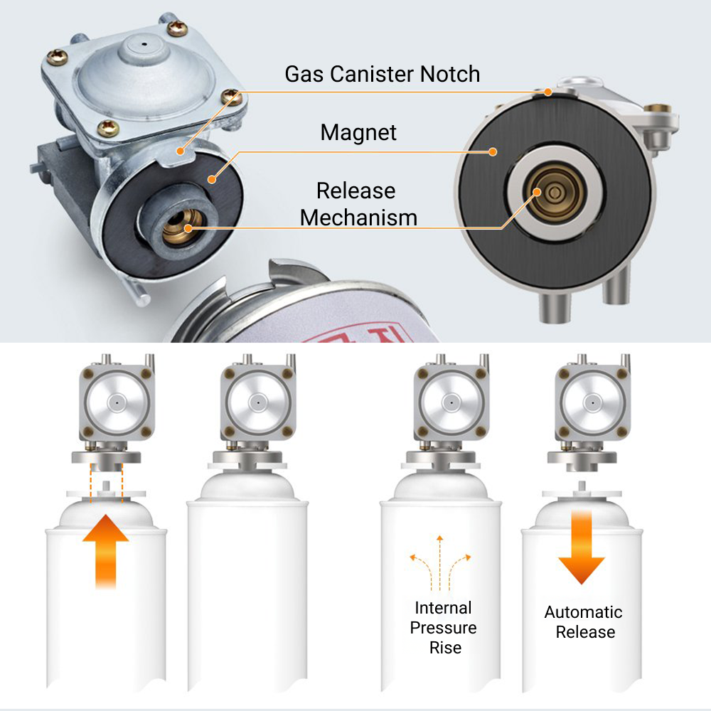 This stove features a magnetic safety governor that uses strong magnetic force for incredibly easy and quick attachment and removal of the gas canister. As an essential safety measure, the system automatically releases the canister if internal pressure rises, ensuring safe operation and peace of mind on the trail.