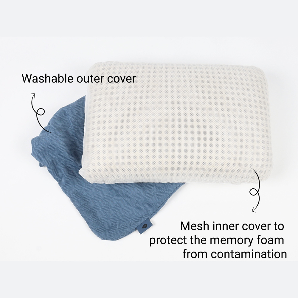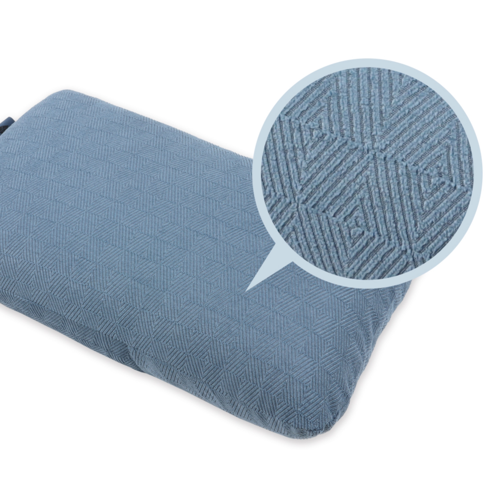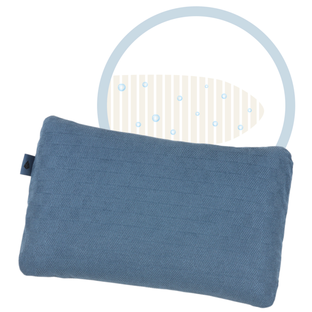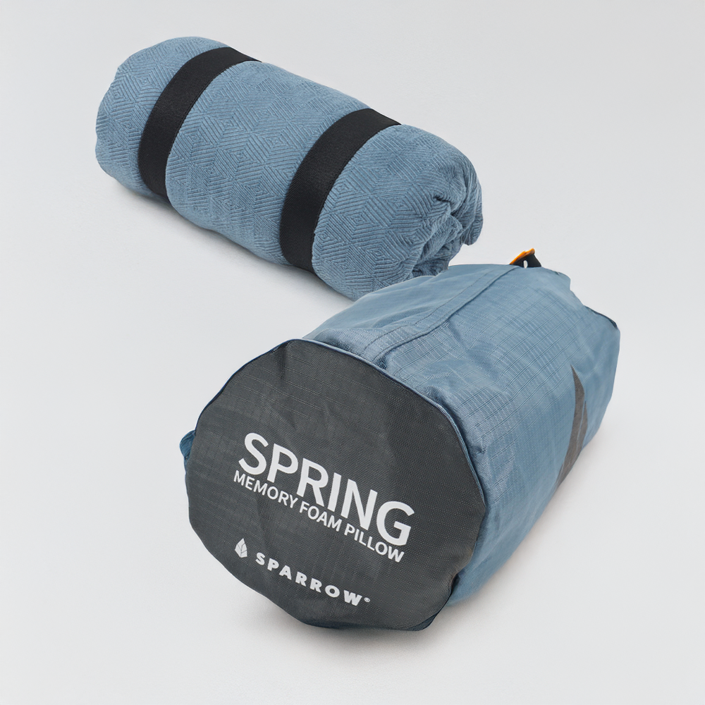 The Spring Pillow features 690 g of solid molded memory foam with Aircell perforation, a double removable cover, cross-pattern fabric to prevent slipping, and elastic straps with cord locks for compact storage.