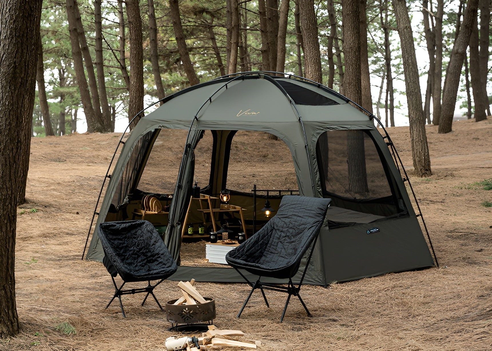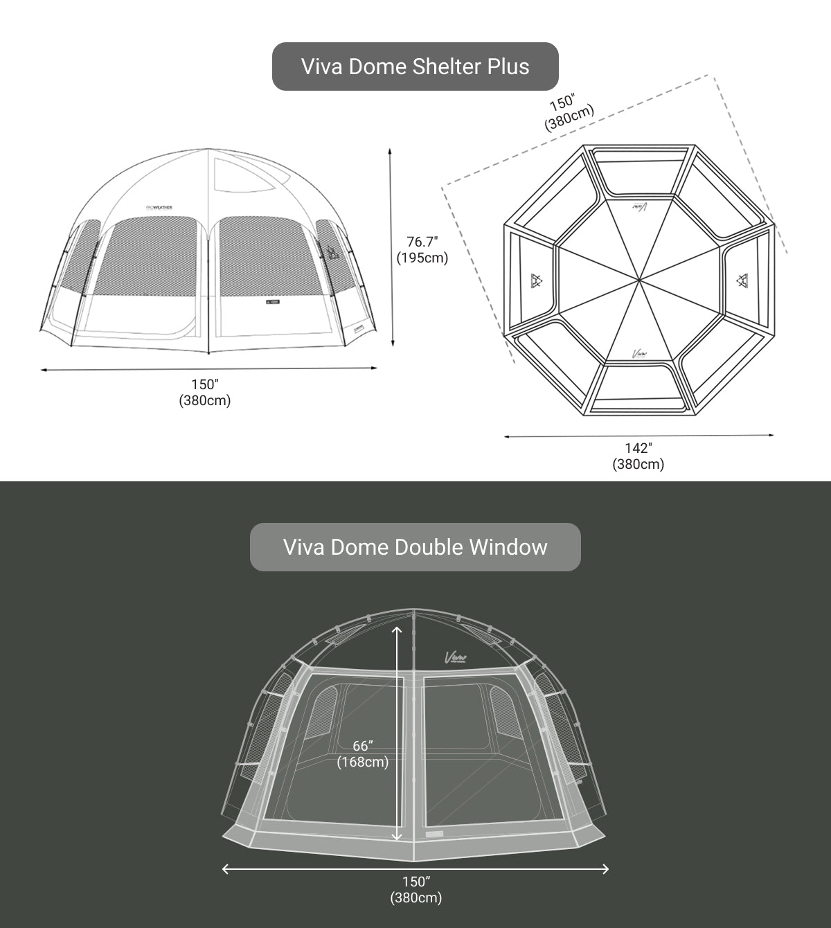 Viva Dome Shelter Plus is a practical freestanding dome shelter that installs easily with just 4 poles. Featuring TPU roof windows and premium coated fabric, it provides superior water repellency, UV protection, and excellent ventilation.