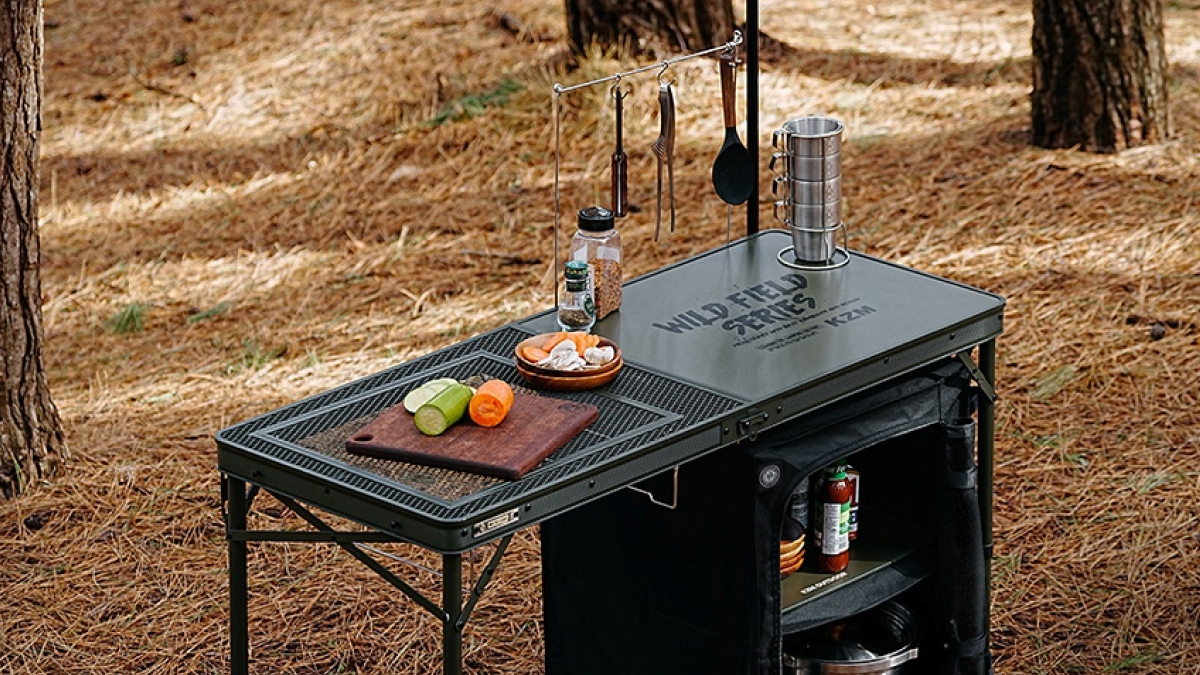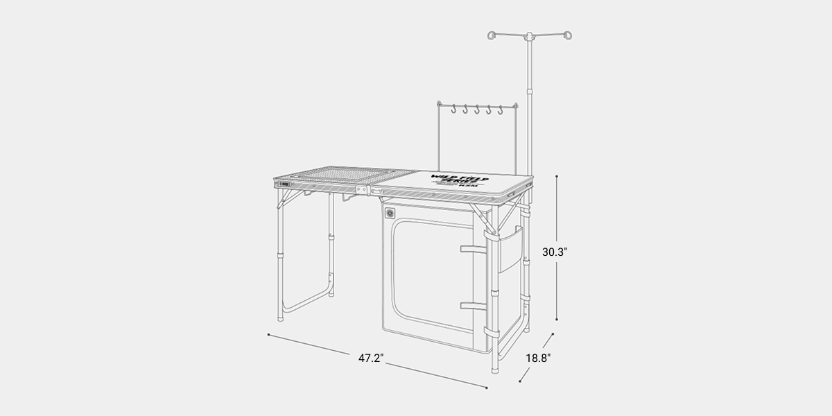 The Wild Field Cabinet Kitchen Table is a versatile, foldable camping table with adjustable height, a detachable two tier storage cabinet, burner compatibility, and convenient hangers for utensils and lanterns.