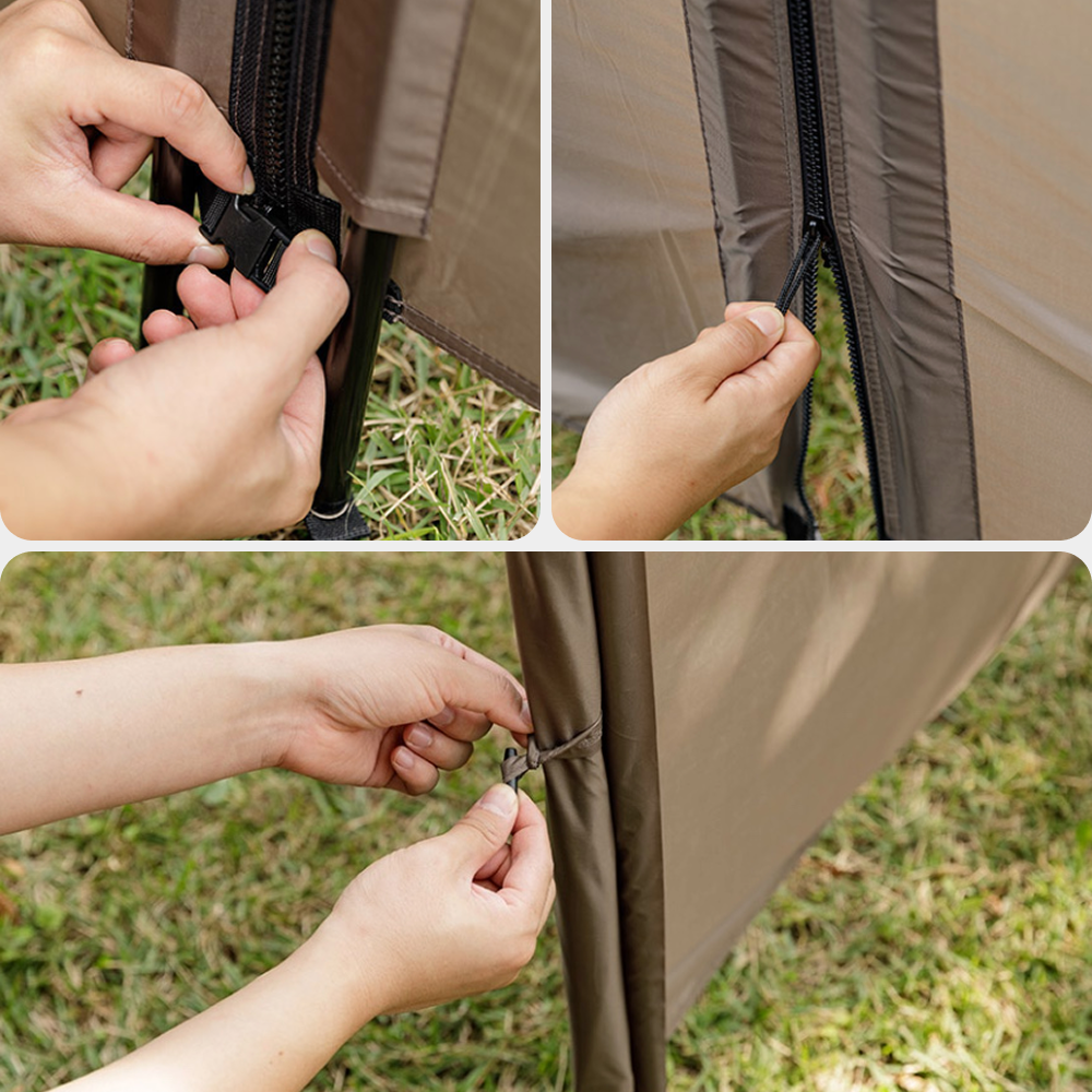 Each screen panel is equipped with user-friendly connection methods—including buckles, zippers, and toggles—allowing for easy detachment and connection. This functionality enables versatile configurations, such as straight or 'L' shapes, to perfectly suit your camping layout and environment.